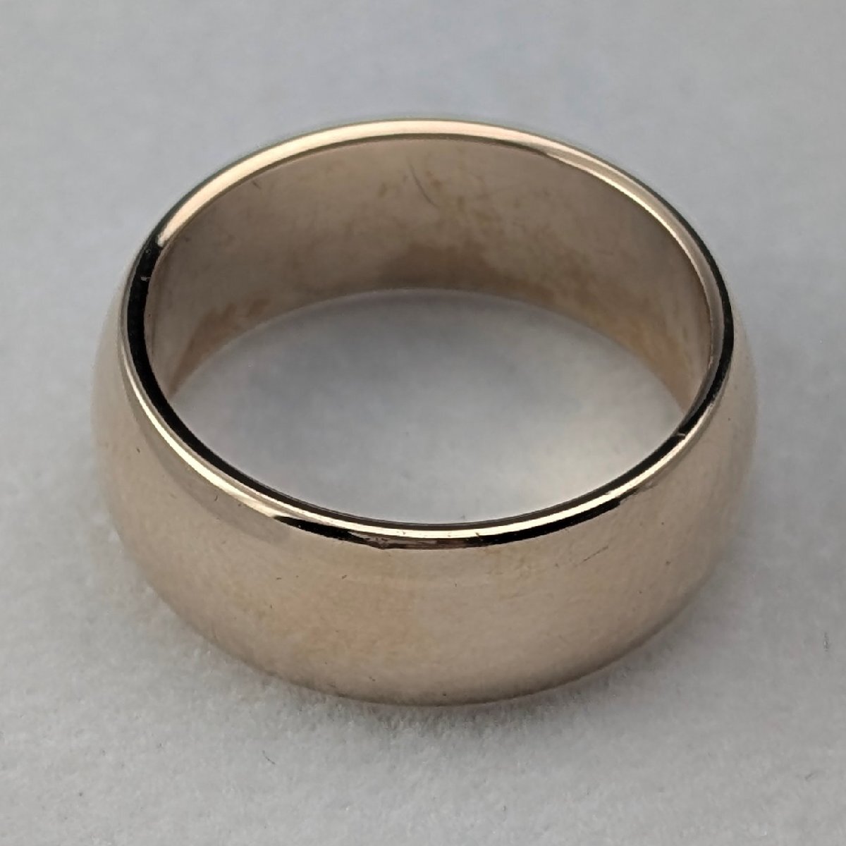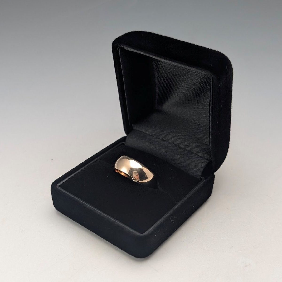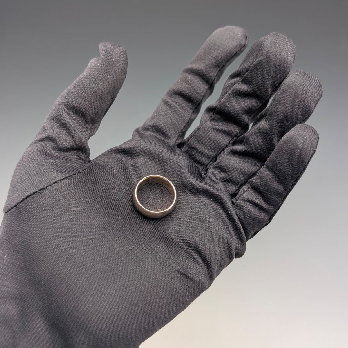 リング幅7mmと幅広タイプで、英国の9ctゴールドらしい「ロイヤルゴールド」と呼ばれる優しい色味となっています。