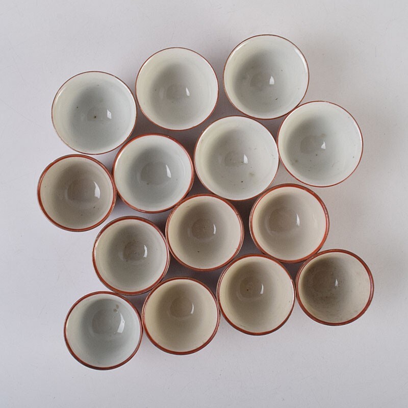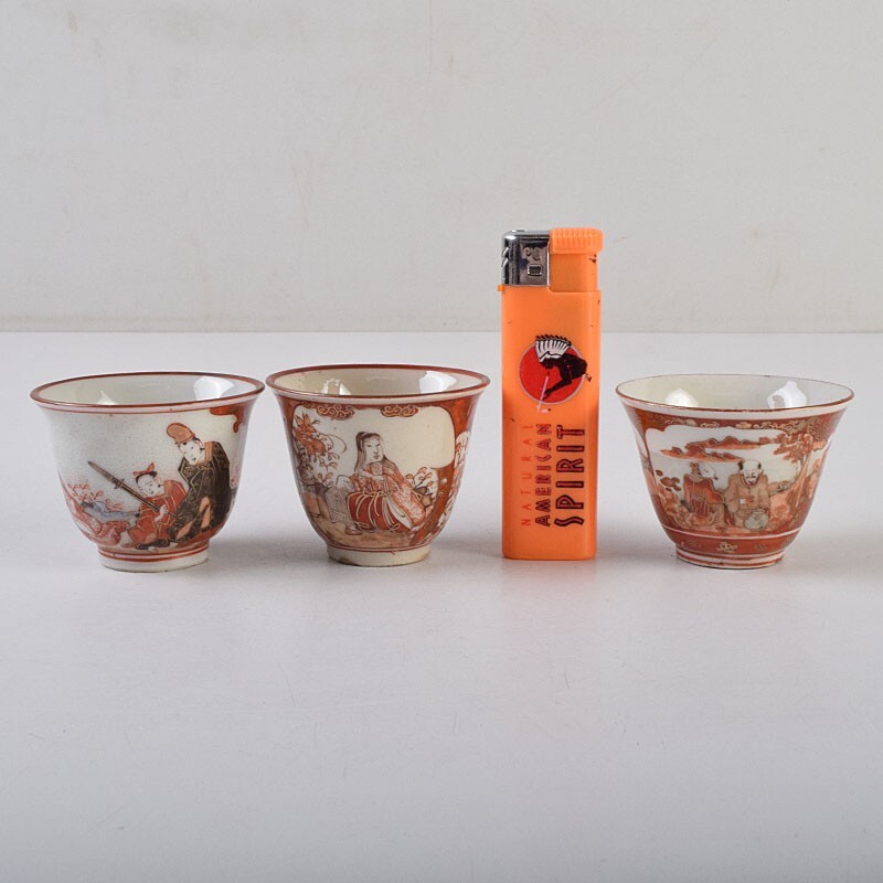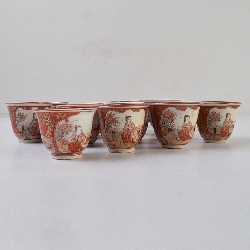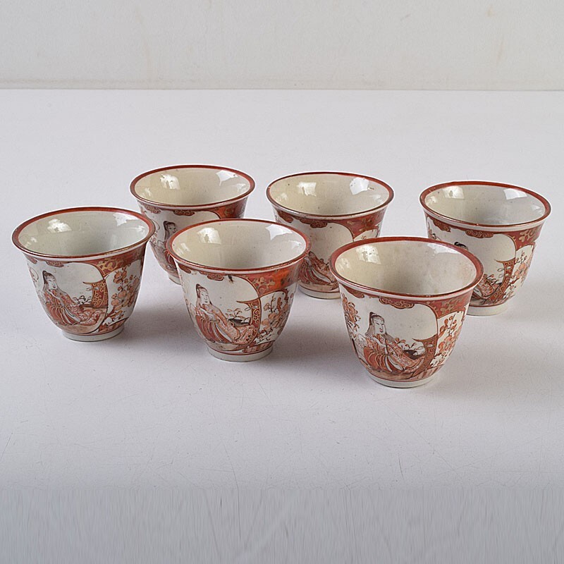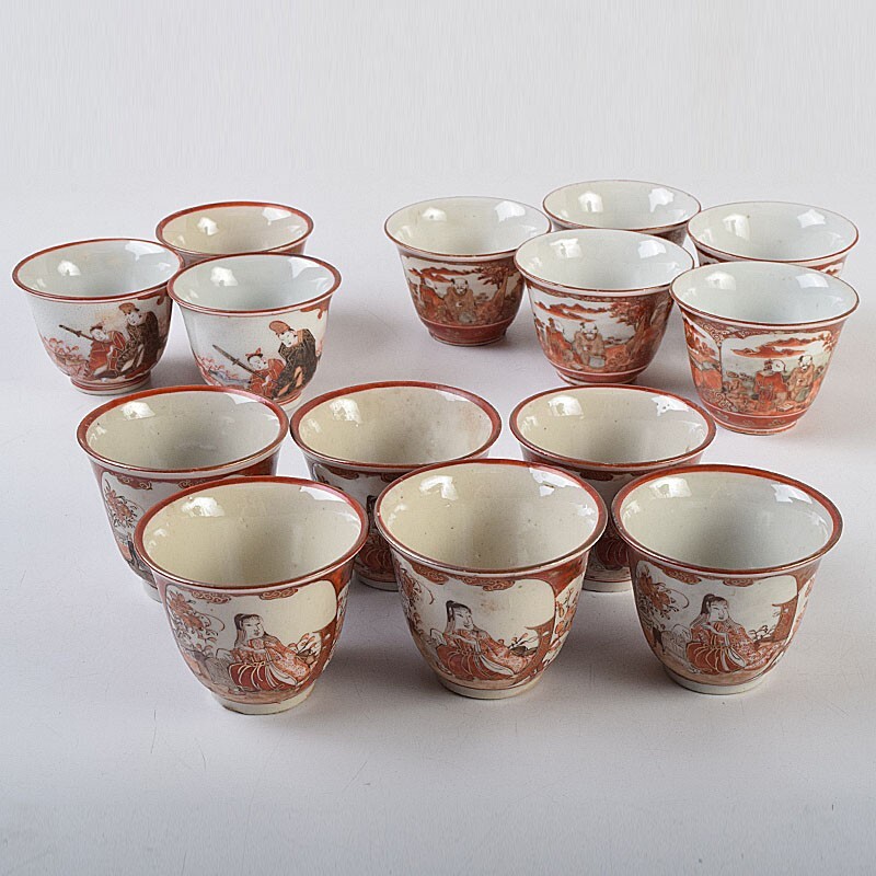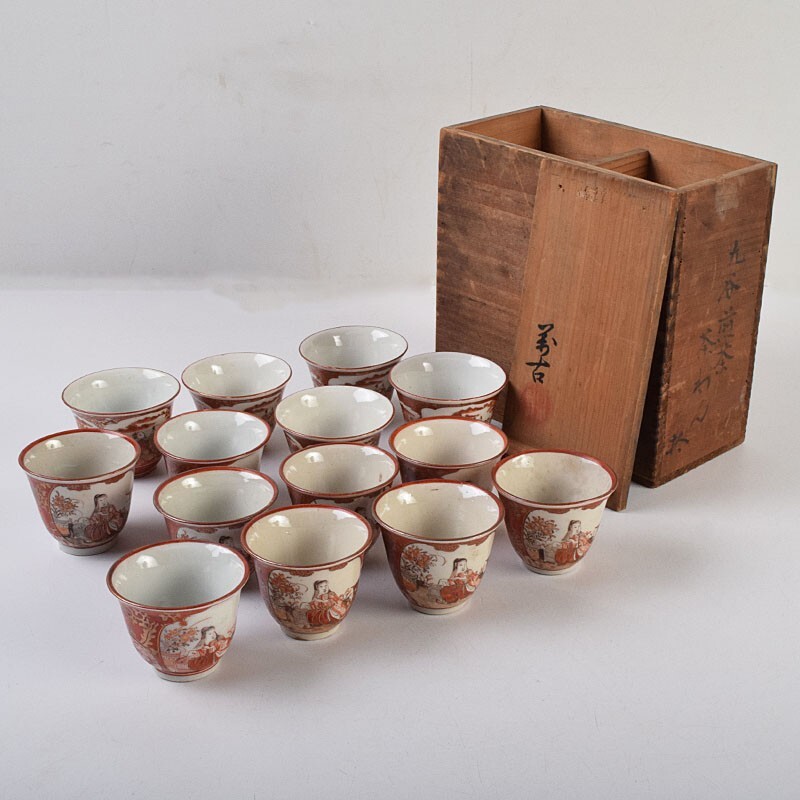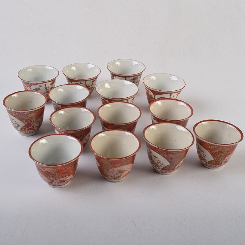 九谷焼 古九谷 赤絵金彩 花鳥山水人物文 煎茶碗 3種十四客まとめて 時代箱付 DUXP