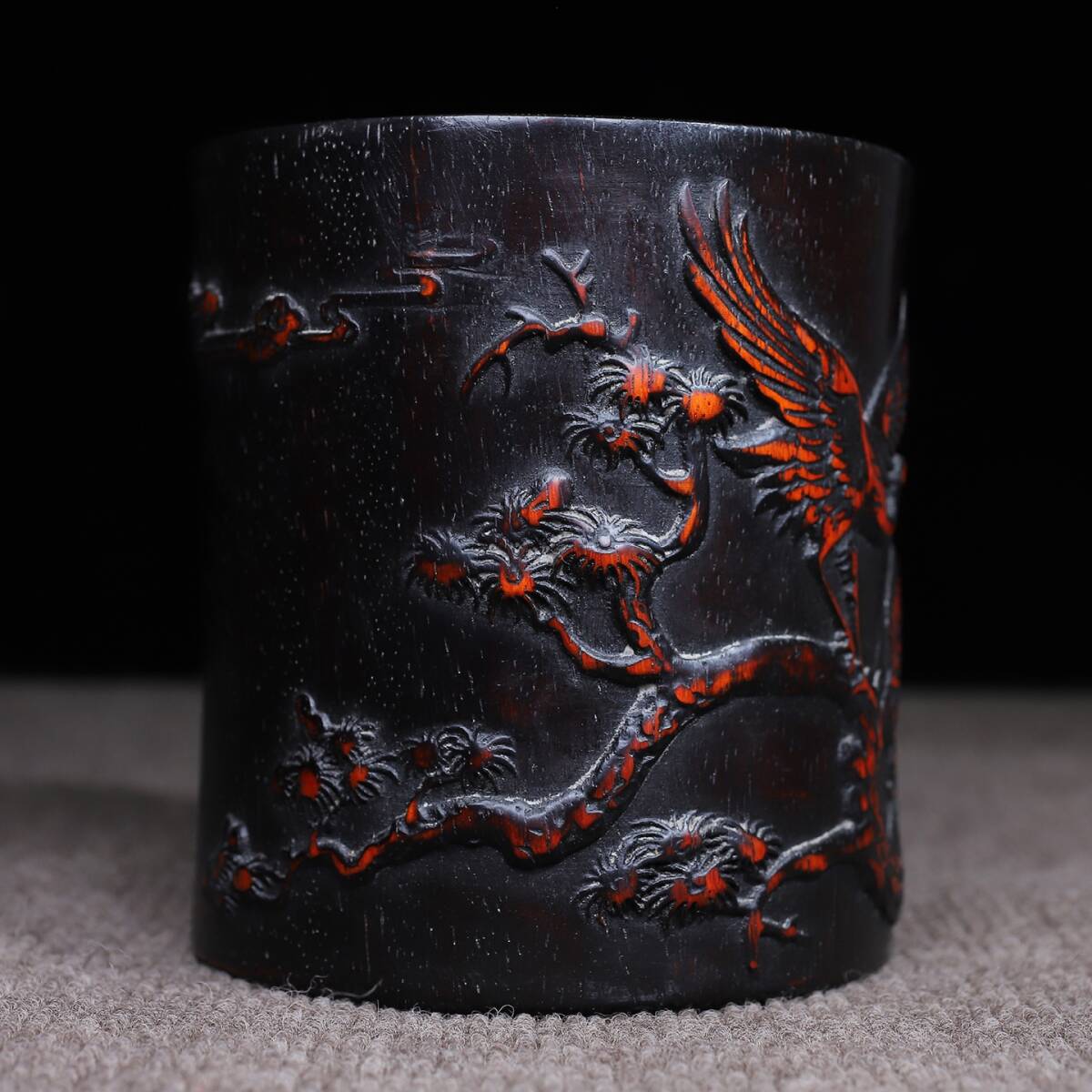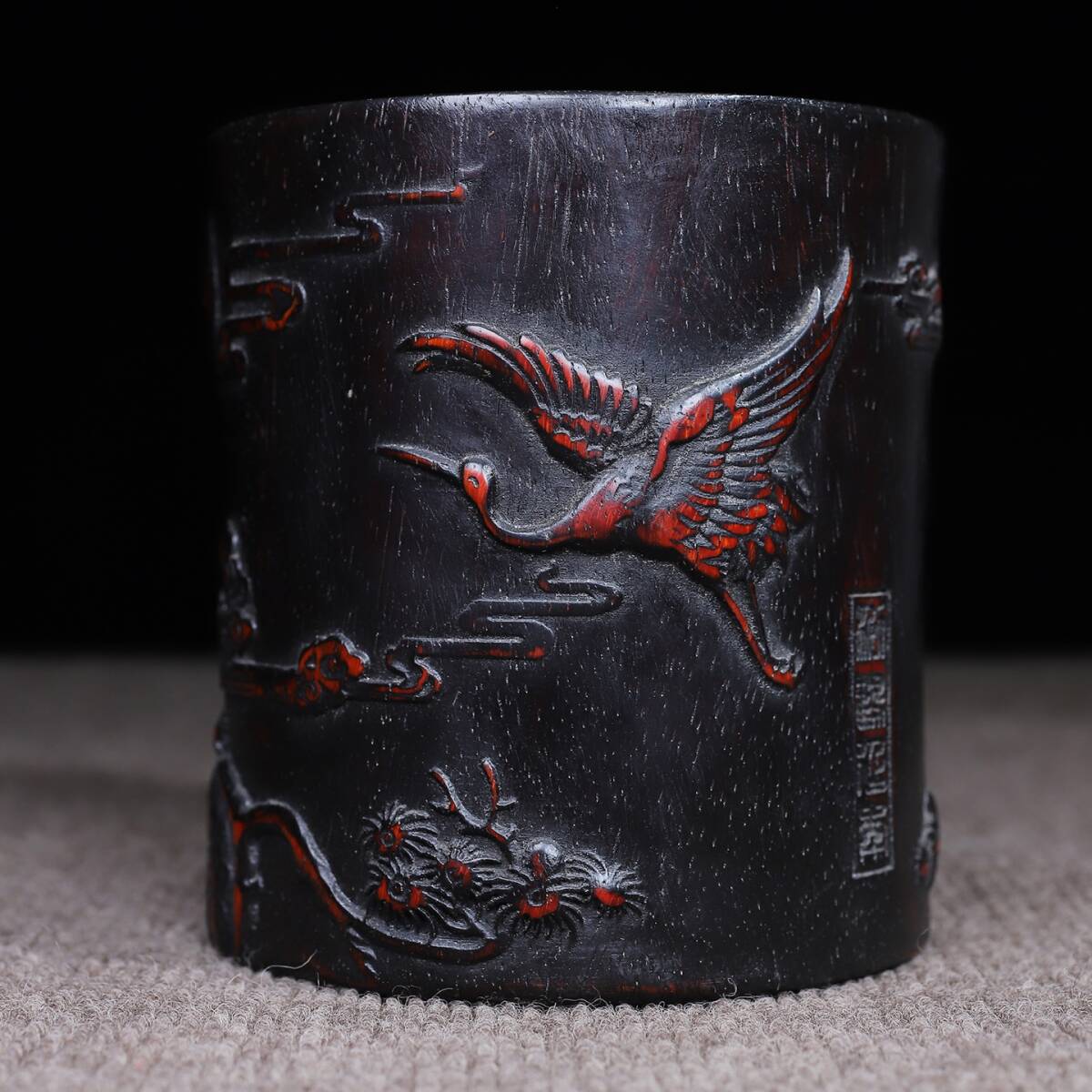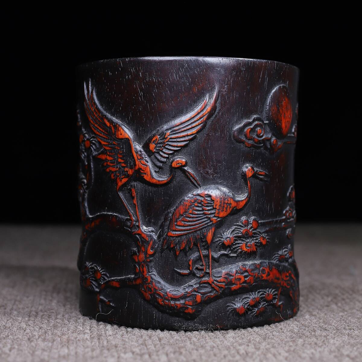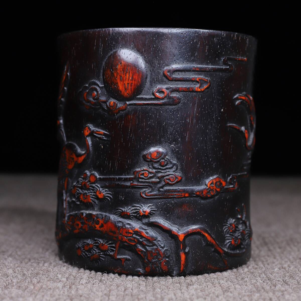 唐物 清 花梨木 彫刻 松鶴延年 圓筆筒 木制 極細工 古美術品 時代物 中国古玩 骨董品 D67
