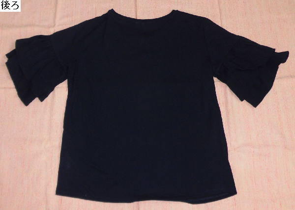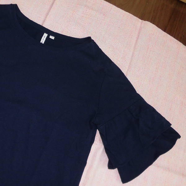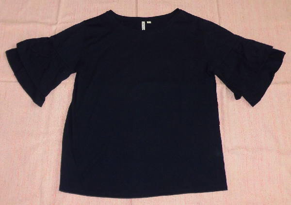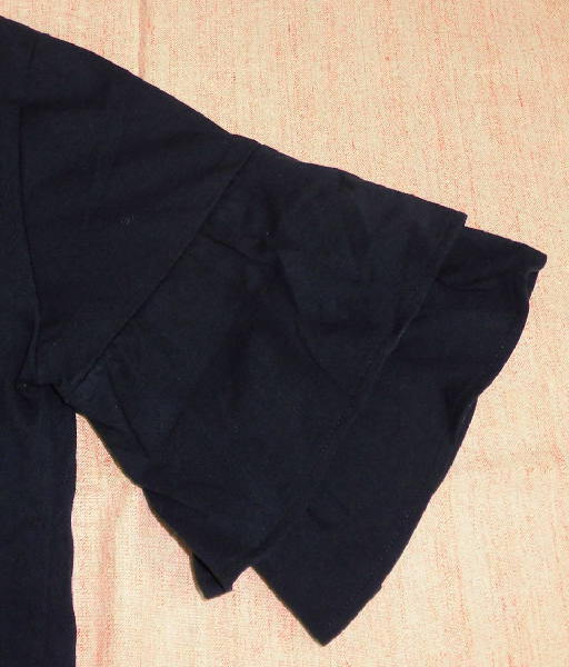 | 数回使用しましたが、比較的キレイです。 ☆ サイズはL、バスト86~94センチ、身長154~162センチ ☆ 色は紺 ☆ 実寸は、身丈57センチ、肩幅39センチ、袖丈28センチ、 脇下の幅44センチ、裾幅49センチ ☆ ポリエステル65%、綿35% ☆ 丸首 ☆ 袖は2重のフリル | ||