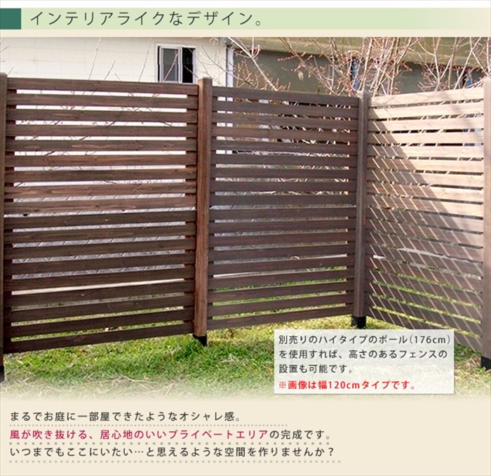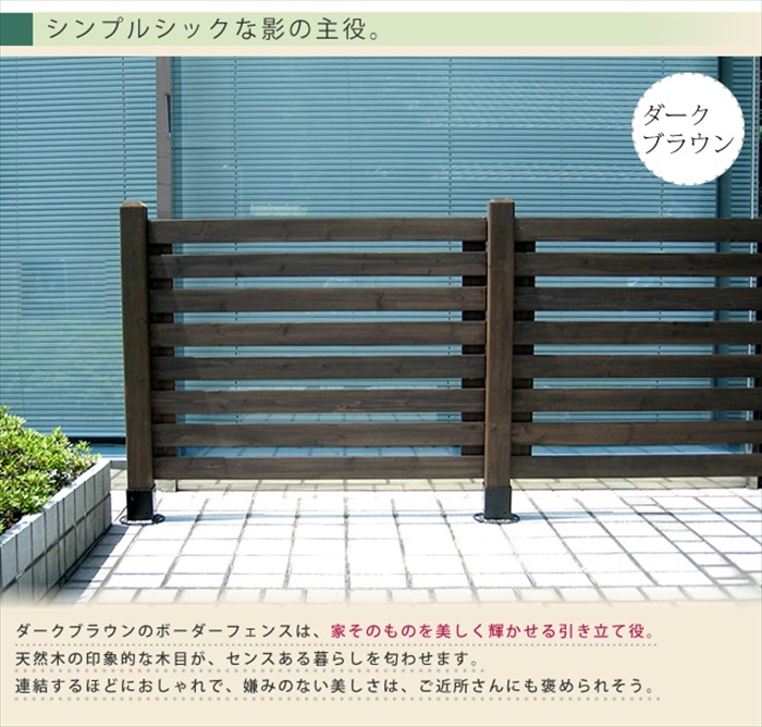 | 【ボーダーフェンス スプレッド(連結セット/平地用)】 新鮮!見栄えが違うボーダーフェンス自分で木製フェンスを設置するなら、断然ボーダーがおすすめです。 爽やかでナチュラルな雰囲気があり、モダンにも、スタイリッシュにも、フレンチカントリーにもマッチする使いやすさが魅力。 ボーダーの間隔が絶妙で、圧迫感がなく、ほどよい目隠しとなるので、防犯に役に立ちます。 気軽に花の水遣りができますね。 小さなお子さんも、お庭で安心して遊べそうです。 自分で手がけた愛着のある簡単DIYフェンスで、癒しのプライベートガーデンを作りませんか。 |
