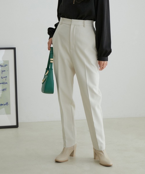 キーワード:スラックス パンツ レディース ウエストゴム スタンダード センタープレス テーパード ハイウエスト フルレングス 無地