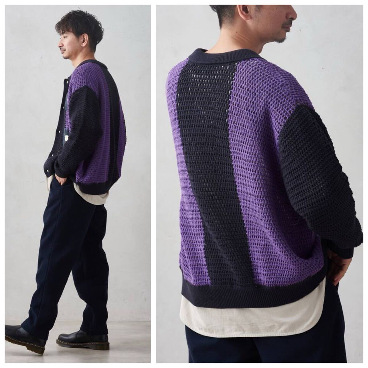 50年代のバイカラーシャツをサンプリングして作製した襟付きニットカーディガンです。