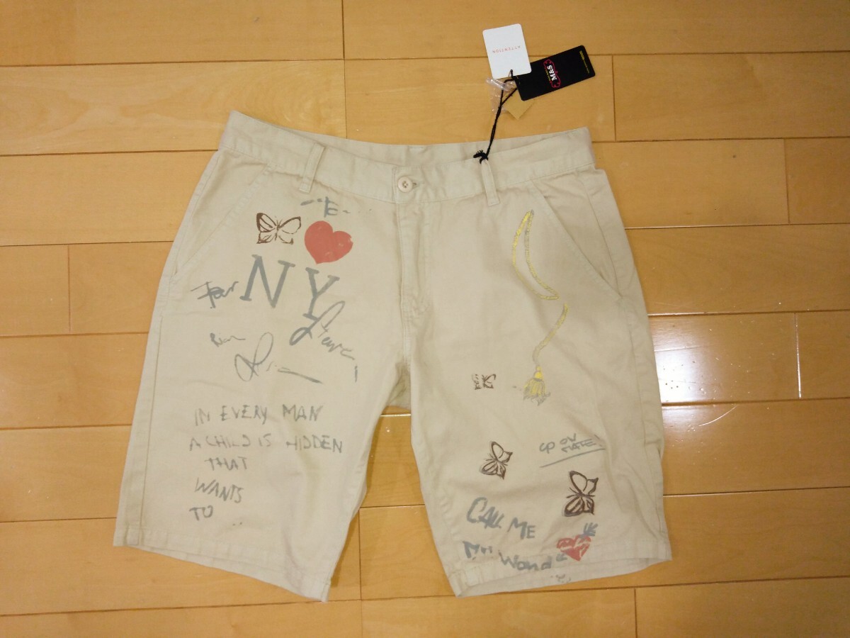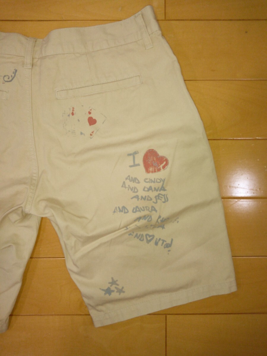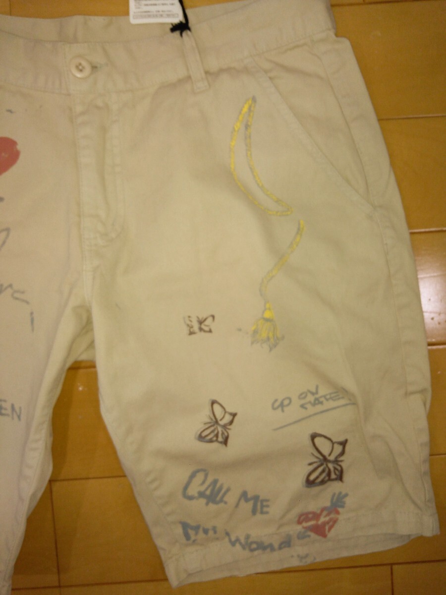 大阪北堀江のデニムショップヴィレッジで5985円購入のパンツです。汎用性のあるベージュのハーフパンツに職人さんが後染めしたパンツです。