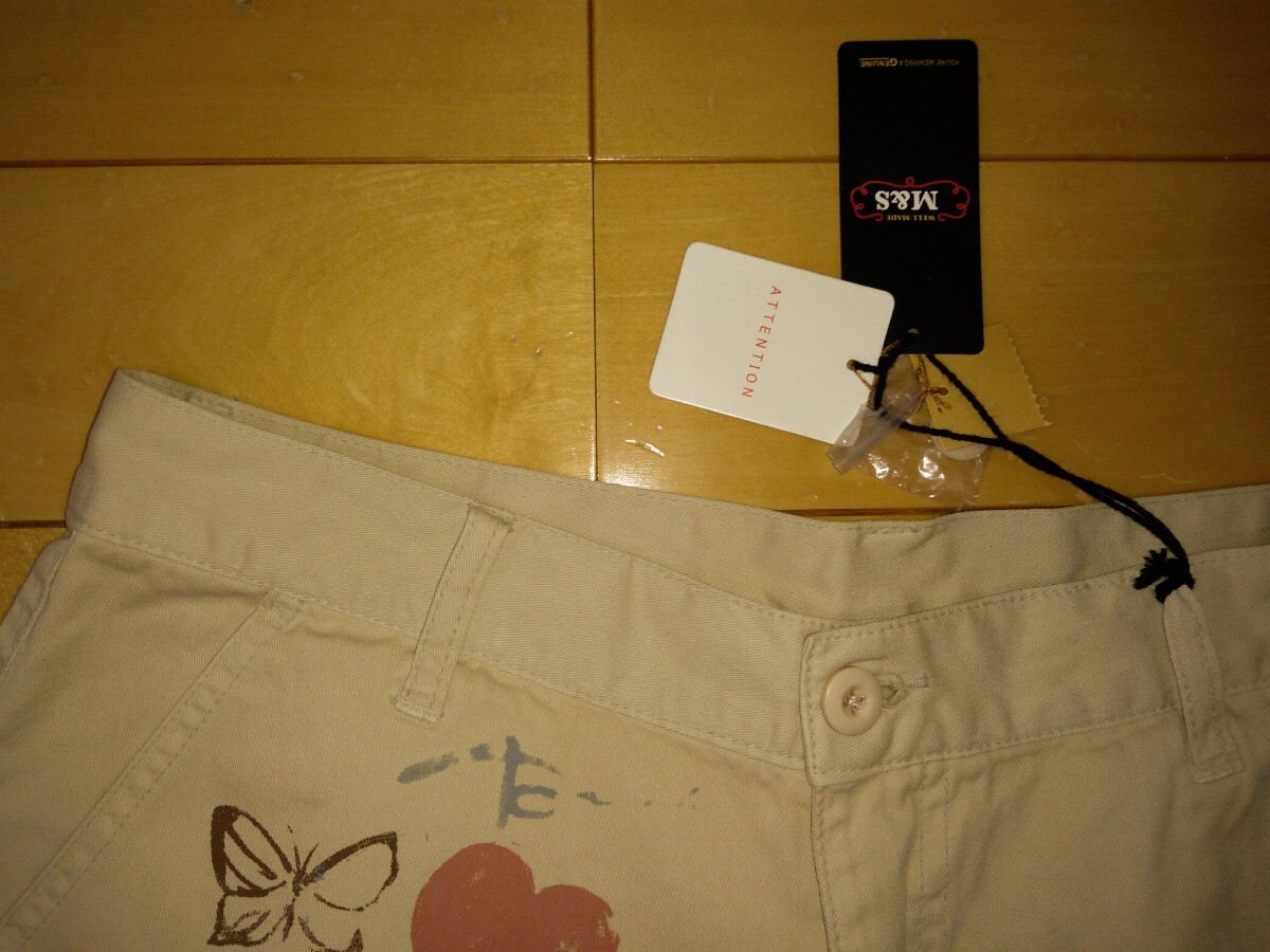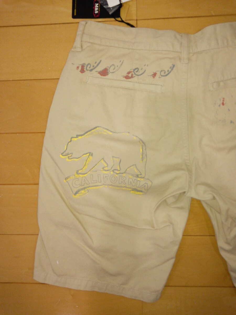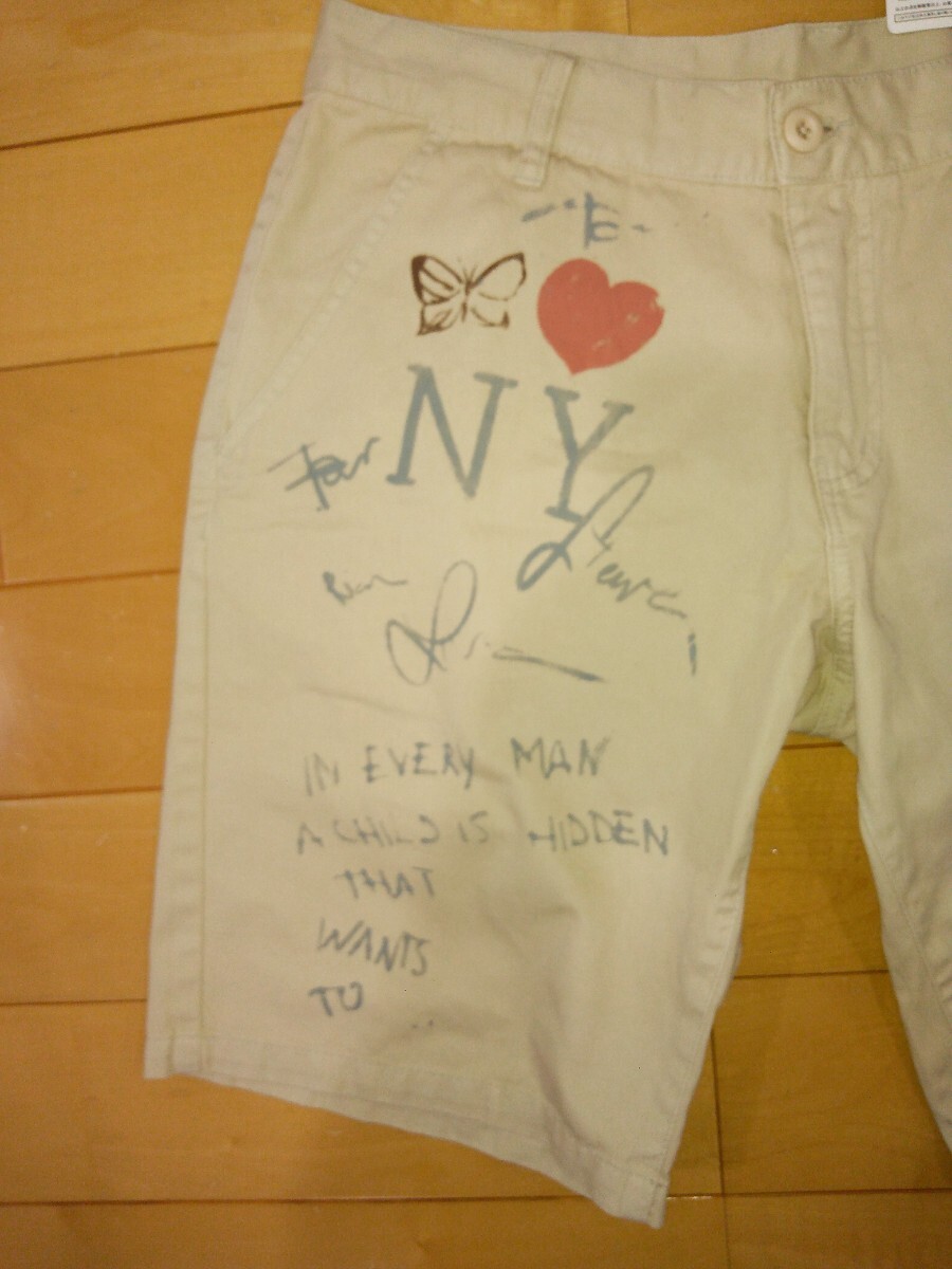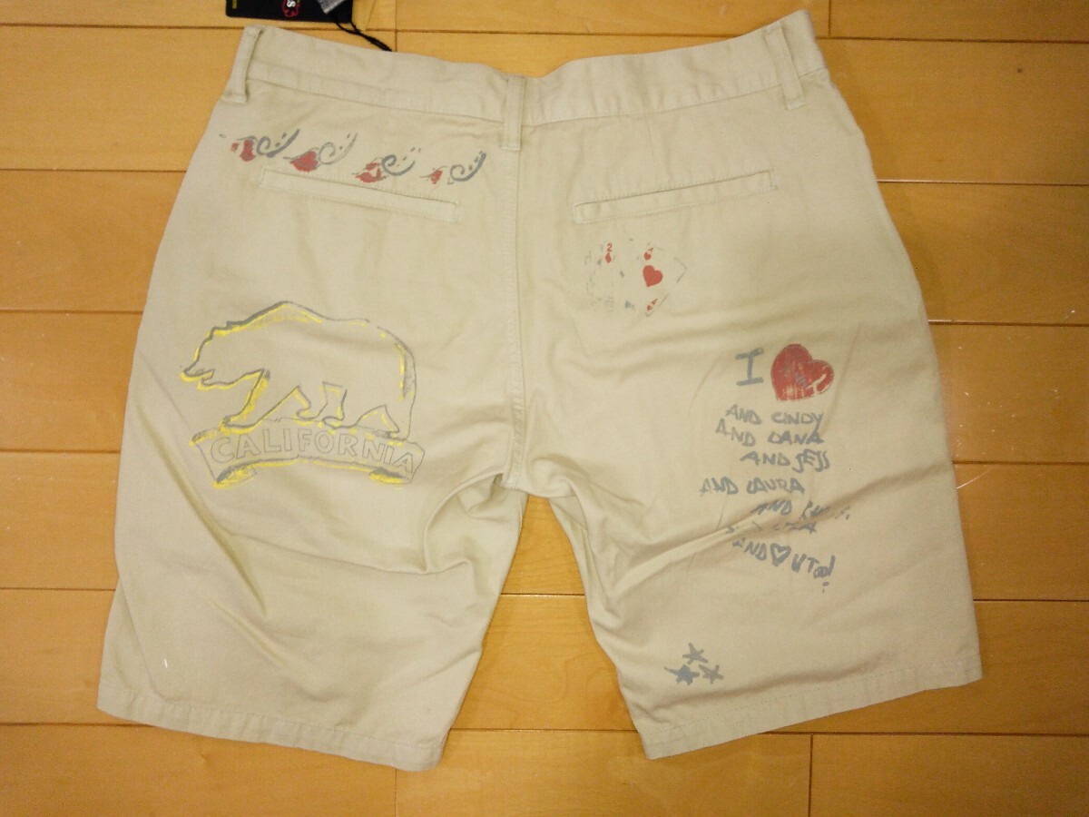 大阪北堀江のデニムショップヴィレッジで5985円購入のパンツです。汎用性のあるベージュのハーフパンツに職人さんが後染めしたパンツです。