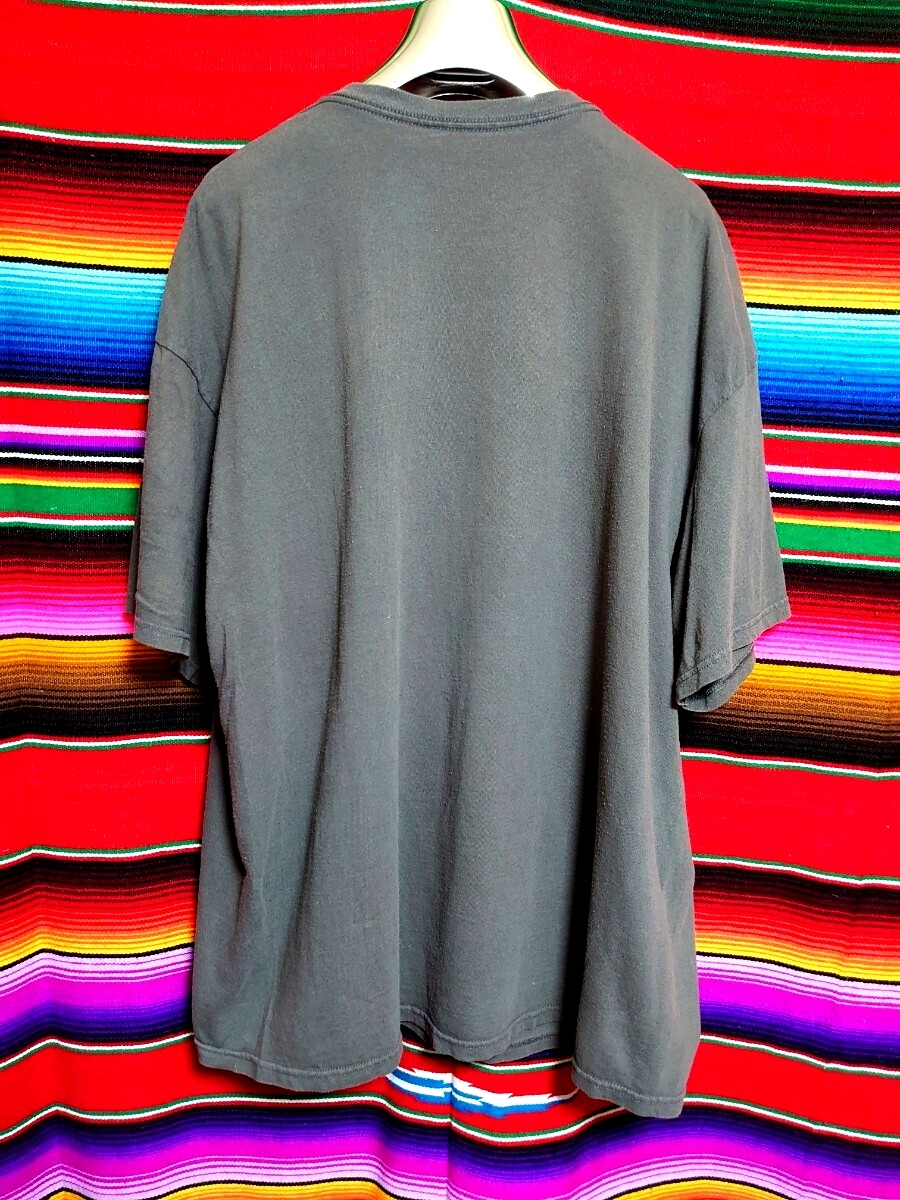 ボディの色褪せとプリントの割れや生地の毛羽立ちが見受けられる古着です。