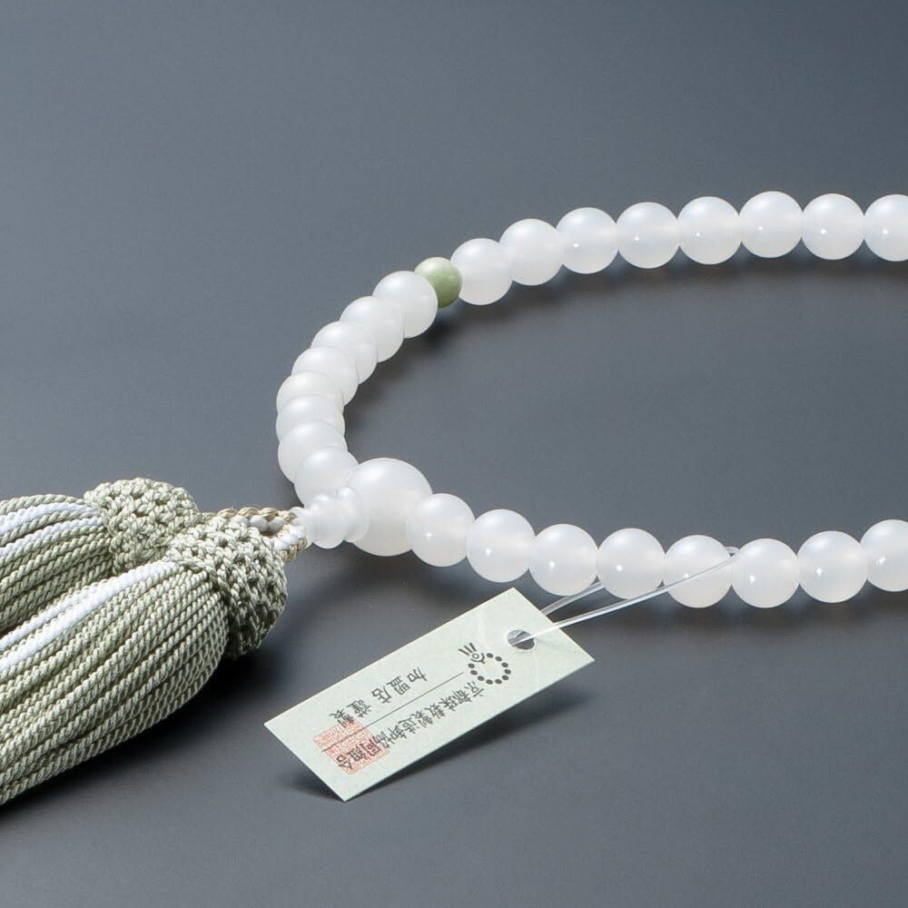 柔らかい乳白色が美しい白オニキスを使用し、アクセントに淡い緑色の独山玉を使用した女性用の念珠です。