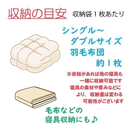 収納目安(収納袋1枚あたり):羽毛布団(シングル~ダブルサイズまで)約1枚※収納する寝具の素材や厚みなどにより収納量は変わる可能性がございます。