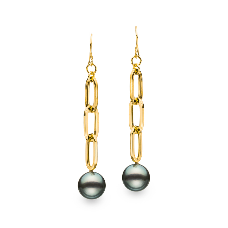 チェーンの駒が3つ連なり、その先に艶やかな黒蝶パールが揺れるデザインは、動くたびに光を受けて印象的な耳元を演出します。