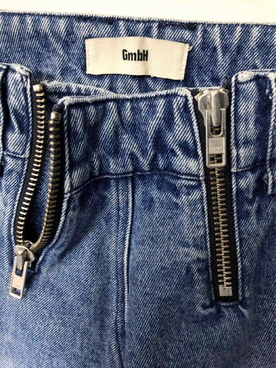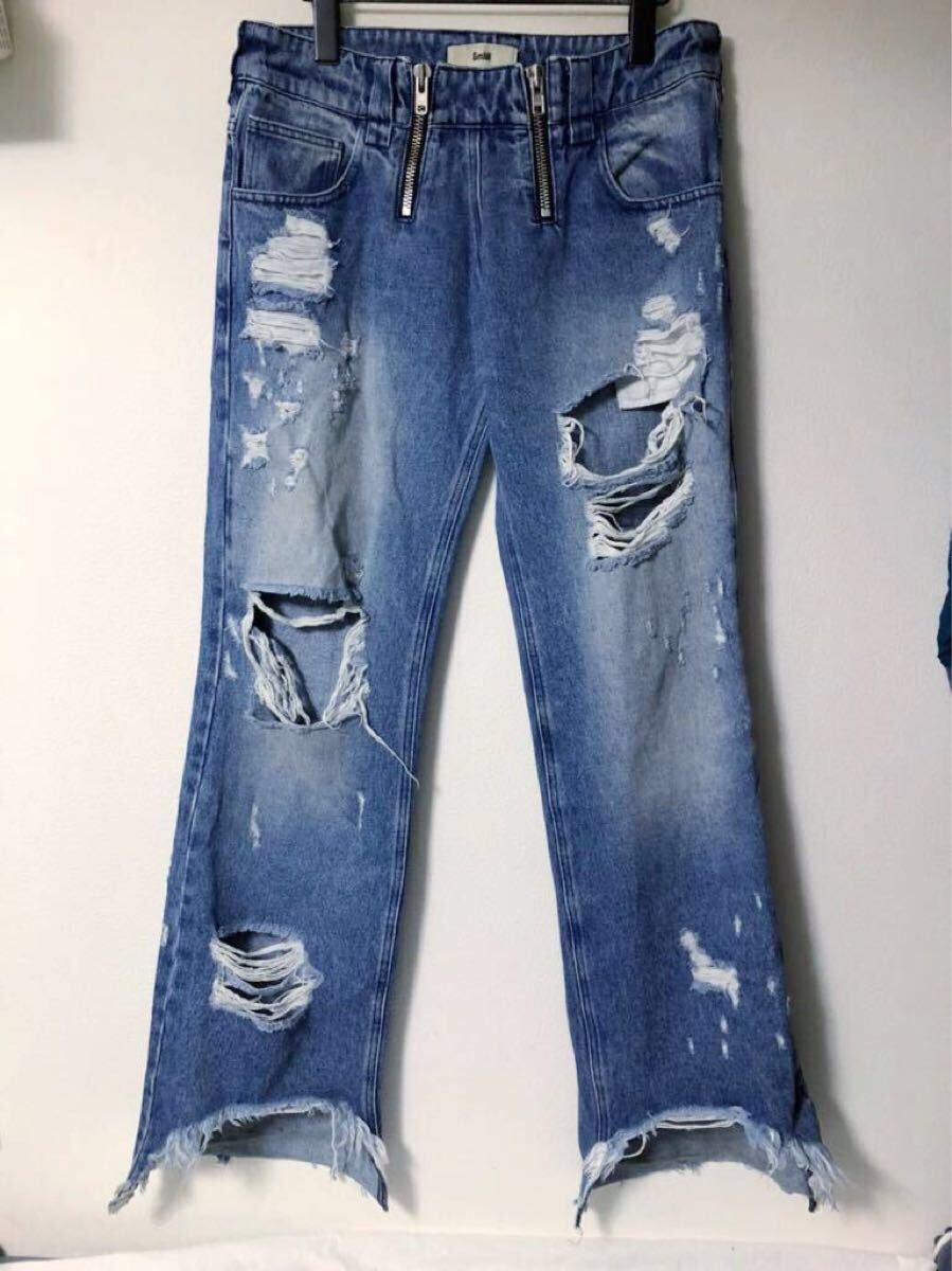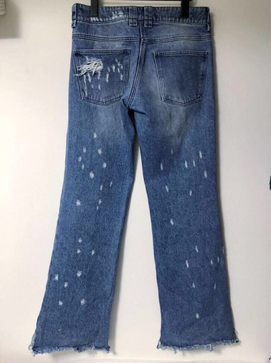 程よくルーズ+フレアなシルエットに、元々裾はカット仕様ですが前を極端にしたディテール、フロントダブルジップが特徴的なデニムです。