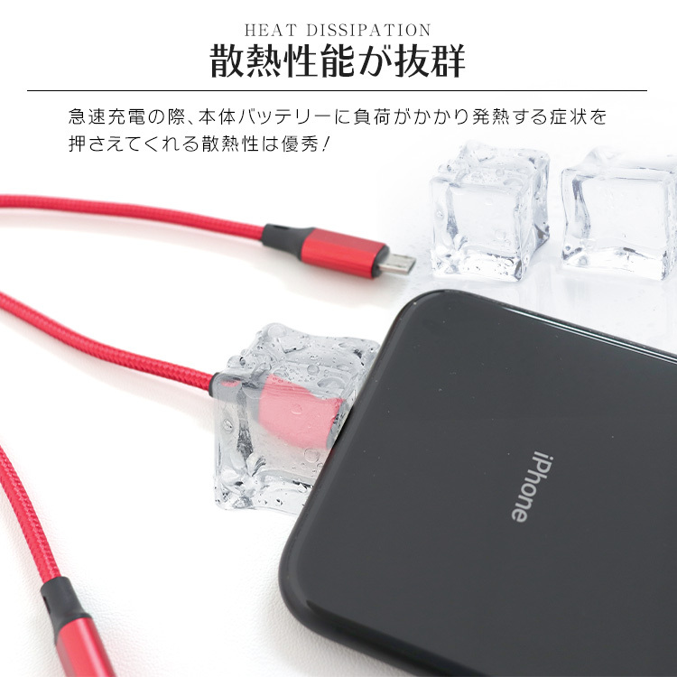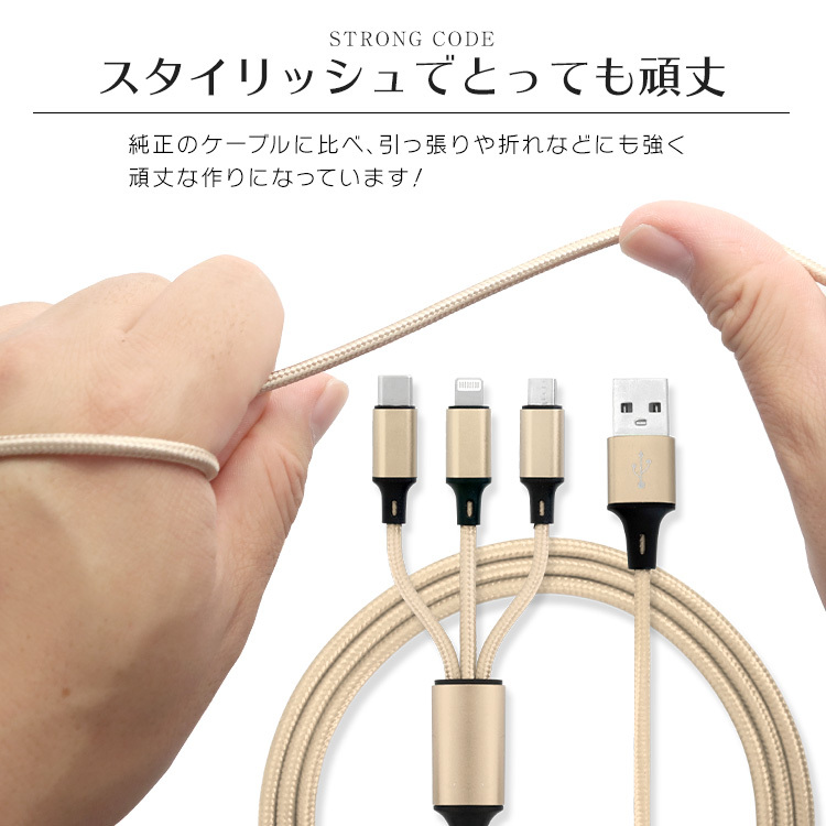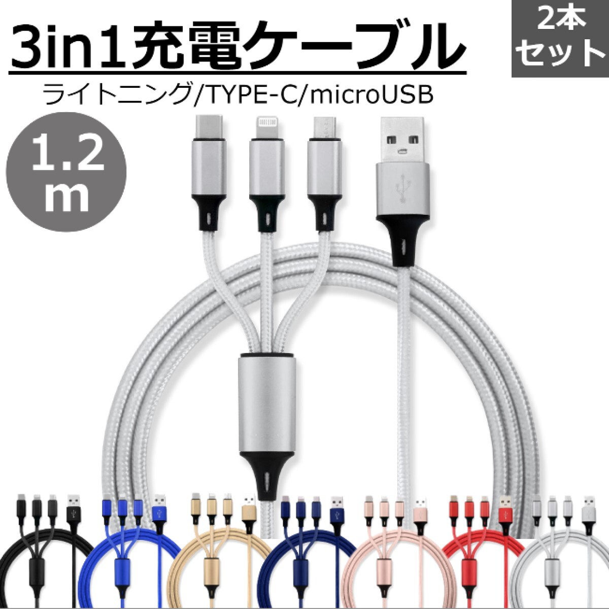 MicroUSBケーブル、Lightningケーブル、Type-Cケーブル、 3in1充電ケーブルです。