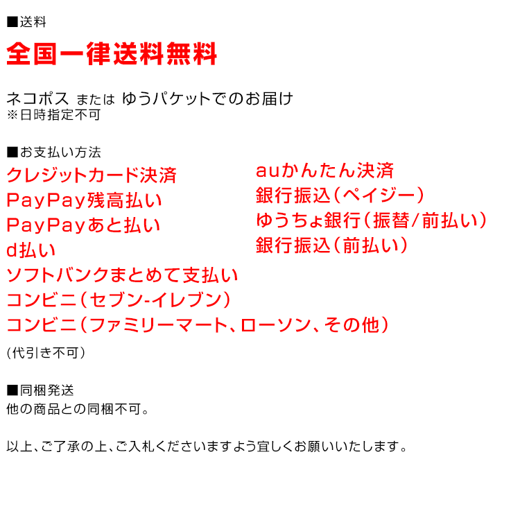 ▼ 商品に関するお問い合わせはこちら ■対応時間 10:00~15:00 土日祝日休業 ※商品に関するお問い合わせや初期不良等のご連絡はやり取りの履歴を残すために、 お手数ではございますが、必ず下記のメールアドレスにご連絡ください。 okuraya_san_ys@yahoo.co.jp ▼ 営業日・支払い方法・発送・返品・交換・保証に関して ※必ずお読みください 営業日・支払い方法・お届けについて・返品・交換・保証に関する件は、以下のページにて詳しく記載しております。 営業日掲載ページはこちら 営業日カレンダー掲載ページ 支払い方法・お届けについて・返品・交換・保証に関する掲載ページはこちら お買い物ガイド詳細ページ プライバシーポリシーに関する掲載ページはこちら プライバシーポリシー記載ページ ▼ 質問が多かった即決落札について 即決で落札する方法 即決で落札するには ├PC版の場合は、商品画像右の「今すぐ落札する」をクリックします。 └スマホ版の場合は、(1)「入札する」をタップします→(2)最高入札額記入欄に、即決の金額(税抜)をご記入頂ければ即決できます。 入札→即決落札した場合の履歴に関して ご入札頂いているYahoo_IDで即決価格で再度ご落札して頂ければ、前の入札の履歴は残りますが前の分はキャンセルとなり、即決価格のみでのご落札となります。重複しませんのでご安心ください。 ▼ オークションに関して 入札後の各種確認メールについて 当店からの受注確認メール・入金確認メール・発送確認メールが「迷惑メールフォルダ」に自動で振り分ける場合がございます。 「フォルダを空にする」前にメールが届いているか一度ご確認ください。 ご落札の際は、以下3つの当店メールアドレスが届くように受信設定をお願いいたします。 okuraya_san_ys@yahoo.co.jp okuraya_san@yahoo.co.jp 当店からの各種確認メールは、オーダーフォームに登録のメールアドレス宛に送信されます。 取引方法 手渡しでの直接取引には対応できません。物流業務を委託していますので、 お近くにお住まいの方でも商品のお受け取りに来ていただくことはできません。 在庫について 当社では、卸販売など各方面でも商品を同時販売しております。 在庫情報は随時更新(新規出品の停止、個数少数での出品、出品取り消しなど)させて頂いておりますが、ご落札頂いた際に時間差などで売り切れになる場合もございます。 予めご了承ください。 商品の価格について 当サイトでは、正確な価格表示に努めておりますが、万が一表示価格やご注文商品の金額に誤りがあった場合、 誤表記を理由にご注文を取り消させていただくことがございます。 取り消しに際し、お客様にはメールにて販売価格をお知らせしご注文を継続されるか否かのご確認をさせていただきます。 なお、これによりお客様にご不便やご迷惑をおかけした場合でも、 直接的または間接的な損害についての補償は致しかねますことを、何卒ご理解のほどお願い申し上げます。 キャンセル お客様都合でのキャンセルはお受けできません。 やむを得ぬ事情により商品発送後にキャンセルをされる場合には、 キャンセル料として返送時に発生した実経費(送料)をお客様側にご負担いただきますので予めご了承ください。 落札後3日以内にご連絡が取り合えないお客様についてはやむを得ずキャンセル処理をさせていただく場合もあります。 交換返品返金について お客様都合での、交換・返品・返金は一切対応できません。 評価について 著しく評価の悪い方の入札はご遠慮願います。 領収書発行について 商品代引きご利用の場合は、伝票が領収書となりますので、別途領収書の発行はできません。 領収書発行希望のお客様は入札後、オーダーフォーム要望欄に必ず「領収書発行希望」をご記入の上ご連絡ください。 |