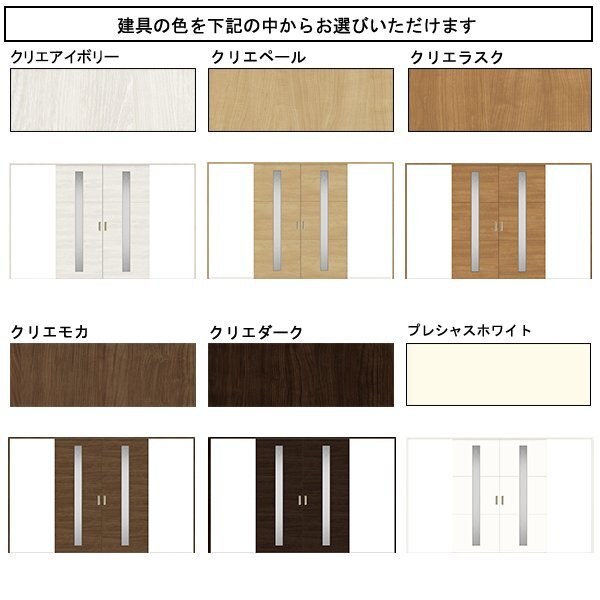 | 商品紹介 | ○ トステムの室内建具 引分け戸 ラシッサS クリエ ○ デザインLGD ○ ノンケーシング * 色をお選び頂けます * 引手色をお選びいただけます * 枠幅を選びいただけます * 敷居を4種類よりお選び頂けます(画像参照) * ガラスの種類をお選び頂けます(画像参照) * オプション・ソフトモーションを(シングル又はダブル)からお選びいただけます。 * オプション・バーハンドル(片側)をお選びいただけます。 * 同時に複数セット、お買上げ頂けますと、送料の値引を致します。 違うサイズ(違う種類)との組合せでもOKです、是非お問合せ下さい。 |