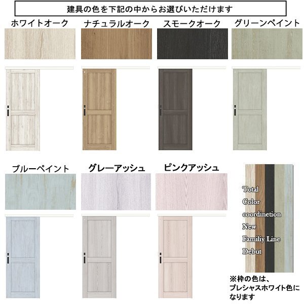| 商品紹介 | ○ トステム (LIXIL) の室内建具 アウトセット片引戸 ラシッサD Palette ○ デザインP-LAH ○ ダブルソフトモーション標準装備 ○ ノンケーシング * 色をお選び頂けます * 引手色をお選び頂けます * 引込勝手をお選び頂けます * オプション・錠を追加できます。(シリンダー錠はカギが3本セットで付きます) * オプション・片面化粧額縁セットを追加できます。 * オプション・入隅用縦部材を追加できます。 * オプション・バーハンドル(片側)に変更できます。 * 同時に複数セット、お買上げ頂けますと、送料の値引を致します。 違うサイズ(違う種類)との組合せでもOKです、是非お問合せ下さい。 |