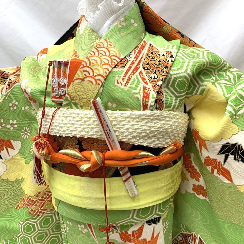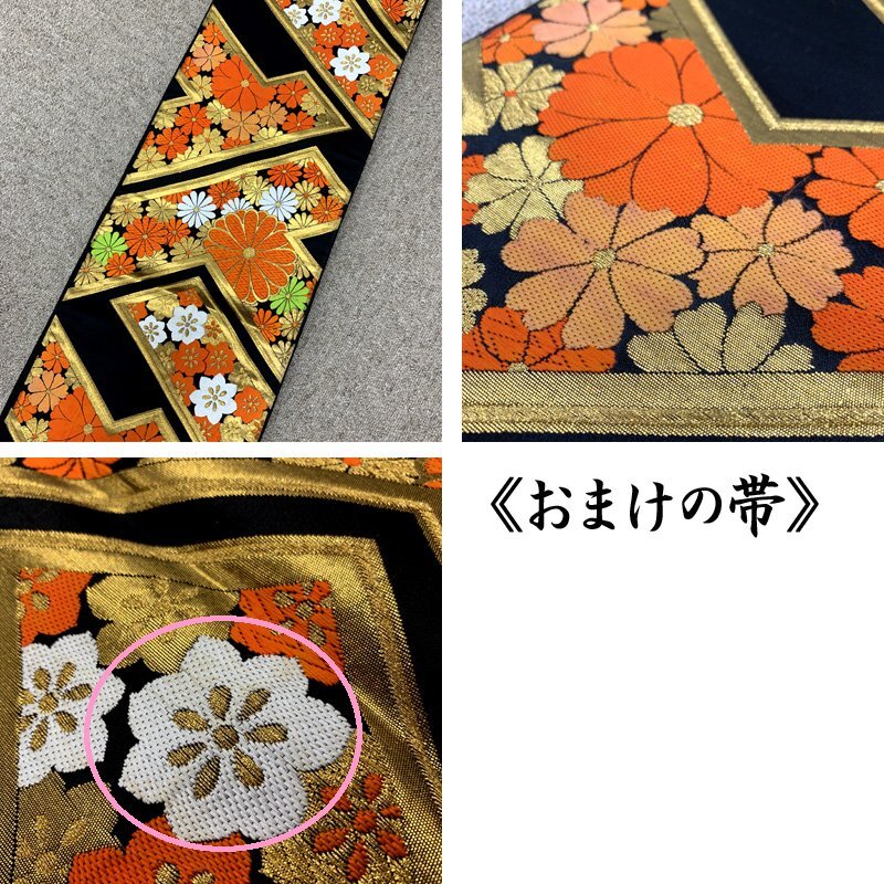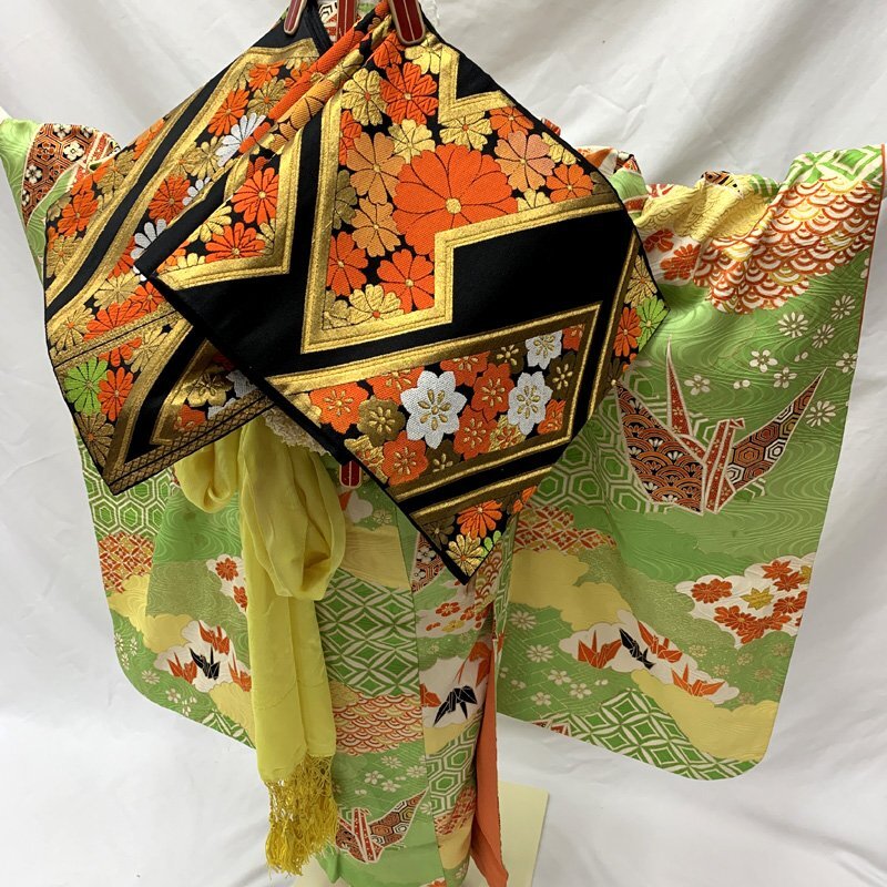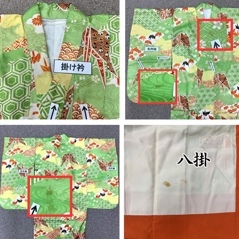 | □七五三 七歳 女児 着物&袋帯(おまけ) 金彩 折鶴 雲取り 黄緑□ (No.n) *こちらの商品は、着物&袋帯(おまけでお付けします)です。黄緑地に、金彩が施された折り鶴や雲取りなどの柄が素敵な7歳七五三のお着物と袋帯のセットです(その他のフリル半衿、付け衿、ヘッドピースはセットに含まれません)。 袴と合わせてハーフ成人式や小学校の卒業式にもご利用いただけます。 画像のお小物類(帯揚げ、帯締め、しごき)は別途3000円、追加で筥迫と末広は+3000円頂戴します。 (着物)内揚げが14.5㎝ございます。画像の矢印部分に、所々シミがございますが遠目から見たらあまり目立ちません。左外袖のシミがやや大きめで、遠目から見たらあまり目立ちませんが気になる方はご購入をお控え下さい。また、胴裏にシミがございますが着用時見えません。 (長襦袢)こちらには長襦袢が付属いたしません。代わりにお子様の負担が少なく、便利な子ども用楽々衿をお勧めします。#ag楽々衿 (帯)帯はおまけでお付けします。色褪せやアクがある部分が所々にございますが近くで見ないと分からない程度です。 【表地素材】(着物)正絹、(帯)正絹 【色】黄緑 *モニターによって色味は実際と異なる場合がございます。 【サイズ】(着物) 裄:53cm、肩上げ:1.6cm、袖幅:30cm、袖丈:66.5cm、丈(肩から):121cm、腰上げ:0cm、前幅:20cm、後幅:26cm (帯) 幅:26cm、長さ:406cm *素人採寸のため、多少の誤差はご容赦ください。 お求め安い価格での出品ですので、いかがでしょうか? | |