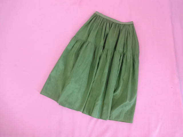 シャカシャカのシルク素材のスカートで、段々に切り替えの入ったティアードスタイル。