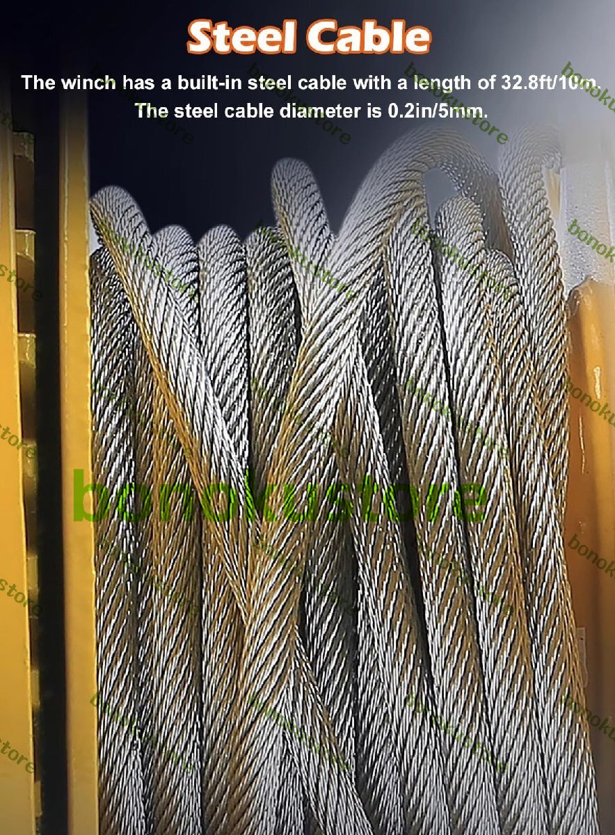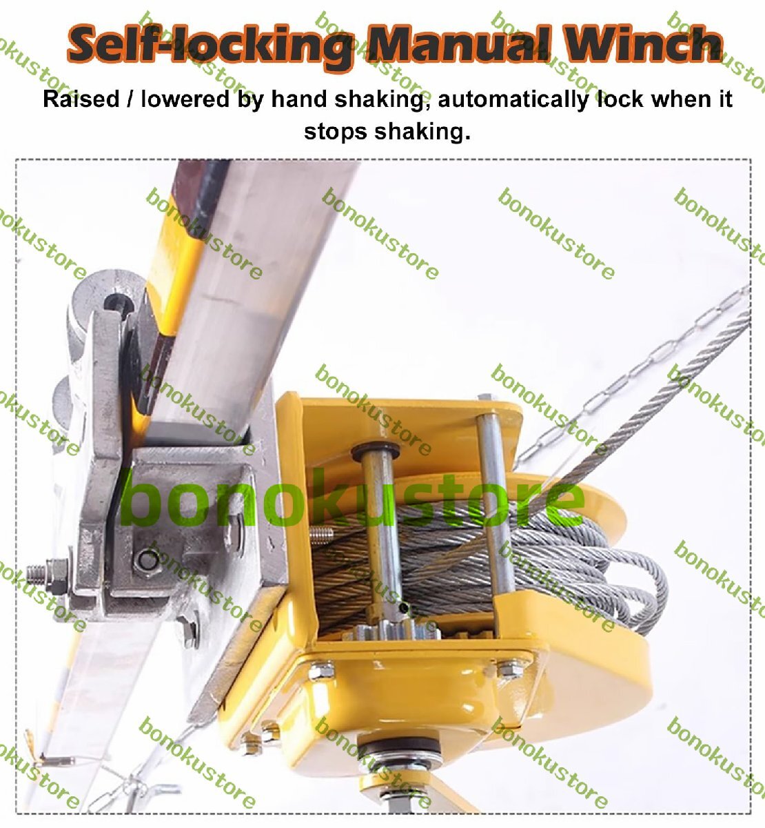 ?? 1800LBS セルフロック式ウインチ --- ウインチには、長さ 98.4 フィート/30 m のスチールケーブルが内蔵されています。スチールケーブルの直径は 0.24 インチ/6 mm です。手で振って上げ下げし、振れが止まると自動的にロックします。人の安全を守り、いつでも任意の高さで停止できます。16.4 フィート/5 m の落下防止システムが含まれており、突然の下降を即座に停止するように設計されています。