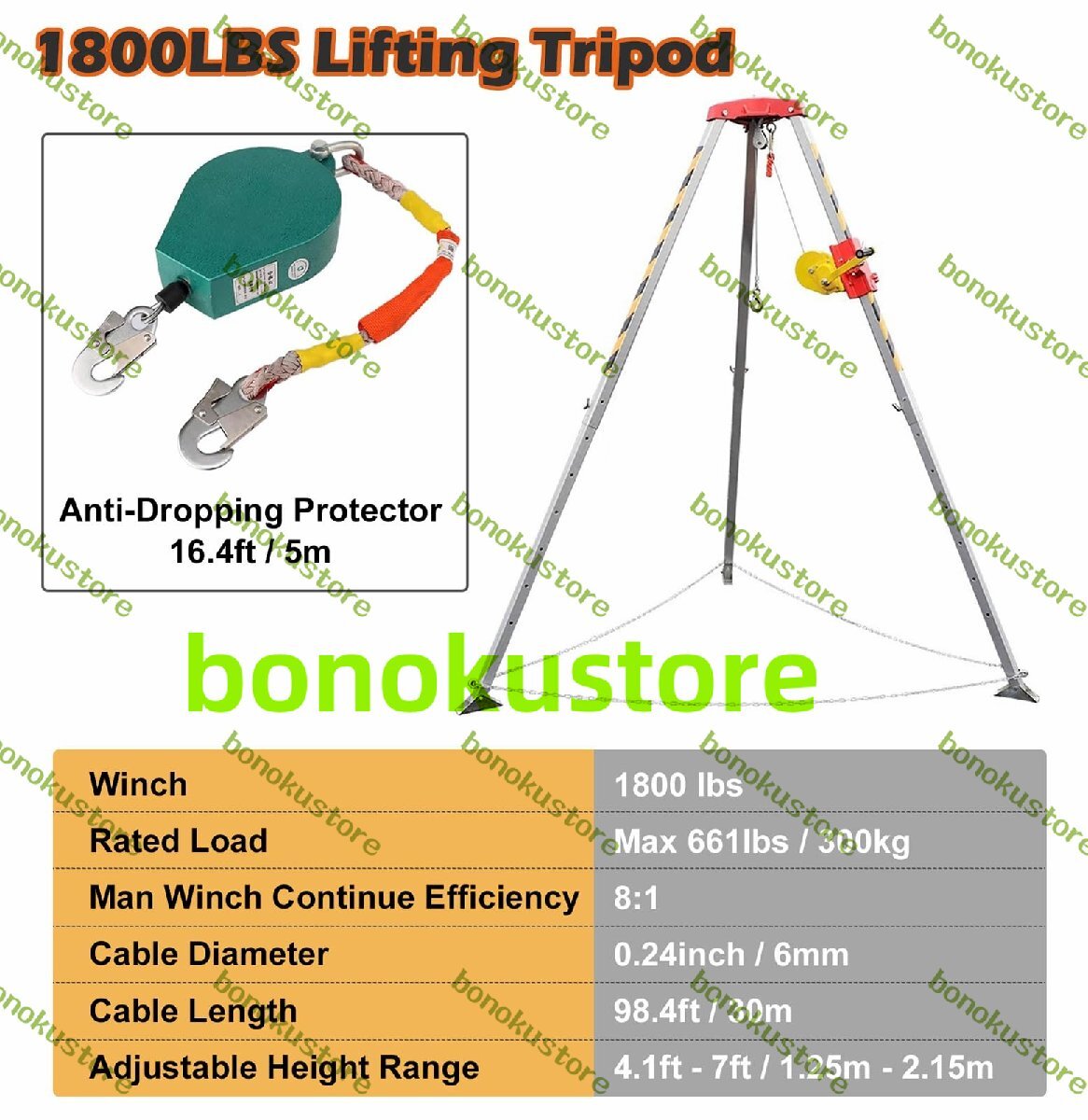 三脚レスキューシステム 救助用具三脚キット、ポータブル密閉空間用三脚ブラケット、1800 ポンド吊り上げウインチ | 落下防止装置 | 頑丈なアルミ製伸縮脚 | 98 フィートのケーブル