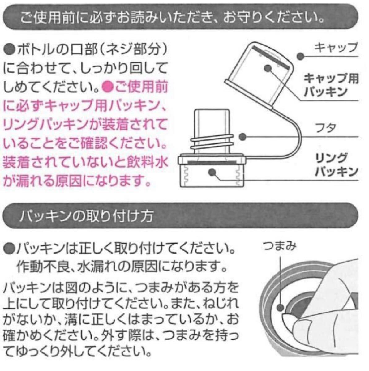 素材・材質:本体・フタ・キャップ=ポリプロピレン パッキン=シリコーンゴム ストラップ=ナイロン