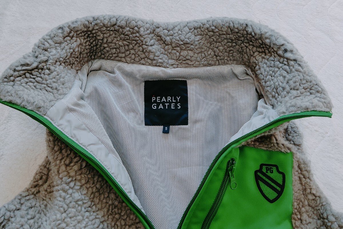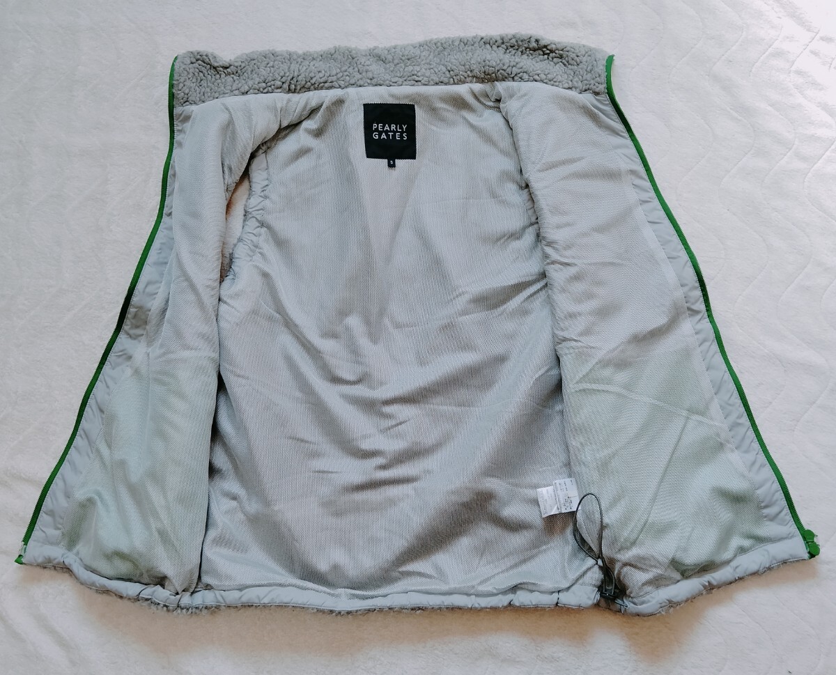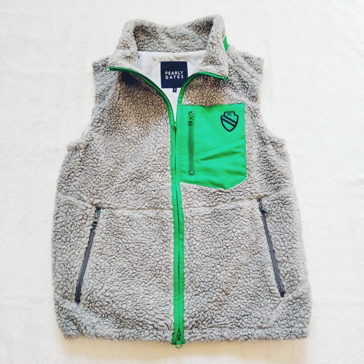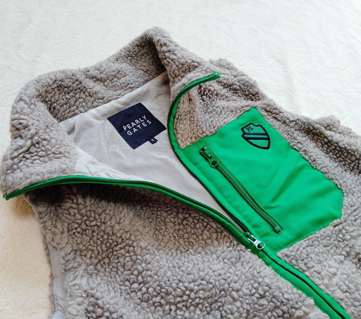 PEARLY GATES パーリーゲイツ*フリースベスト*大きいサイズ5*グレー×グリーン*モコモコボア*ジップアップ*ゴルフウェア*