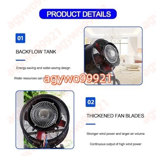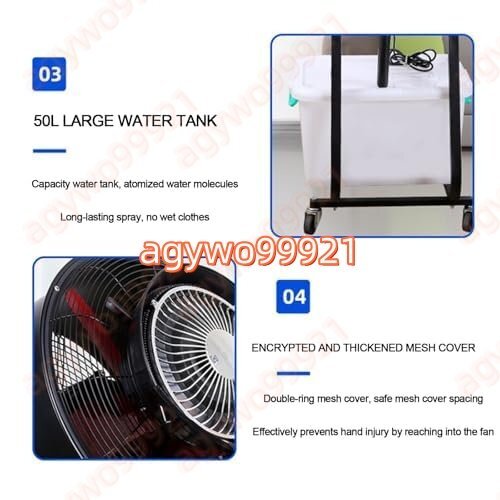 大容量水タンク:この屋外用水タンクファンには、ウォーターポンプと50リットルの大容量水タンクが内蔵されており、満水後約10時間使用できます。また、水タンクに氷を入れて冷却効果を高めることもできます。