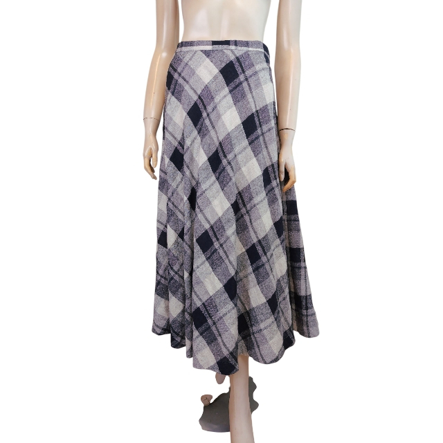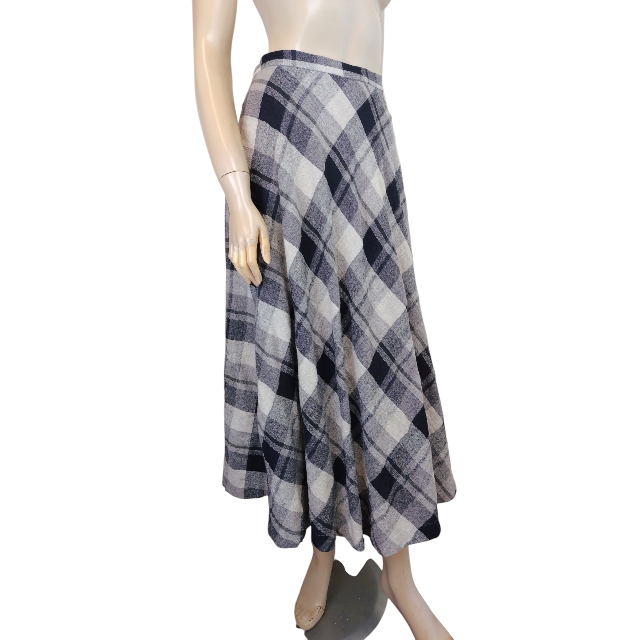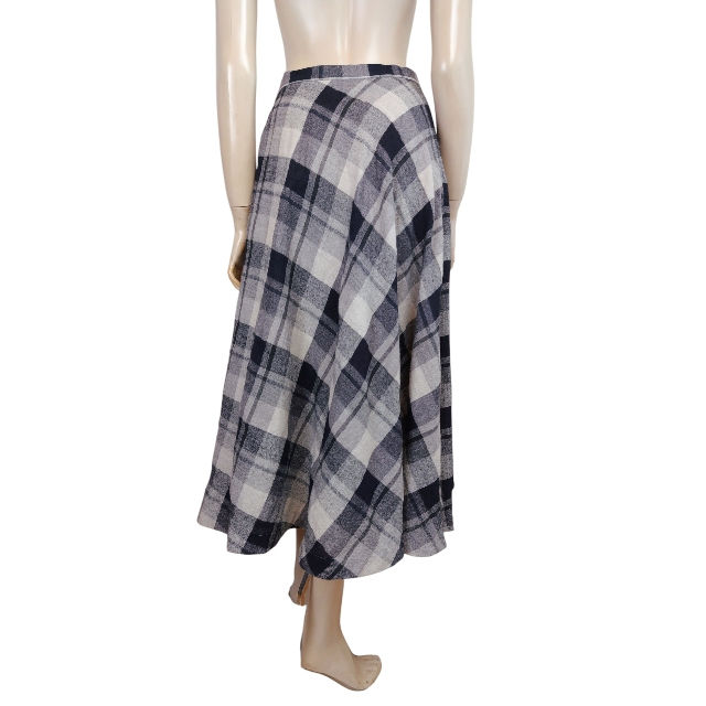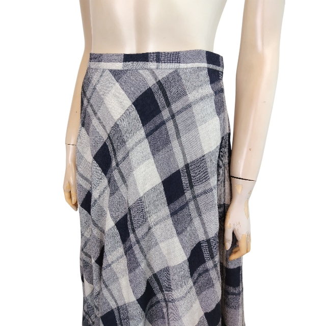 新品同様★ダーマ*DAMA*麻(リネン混*タータンチェック柄*紺ネイビー系*たっぷりフレアー*ロングスカート*大きいサイズ13号.LLサイズ.42