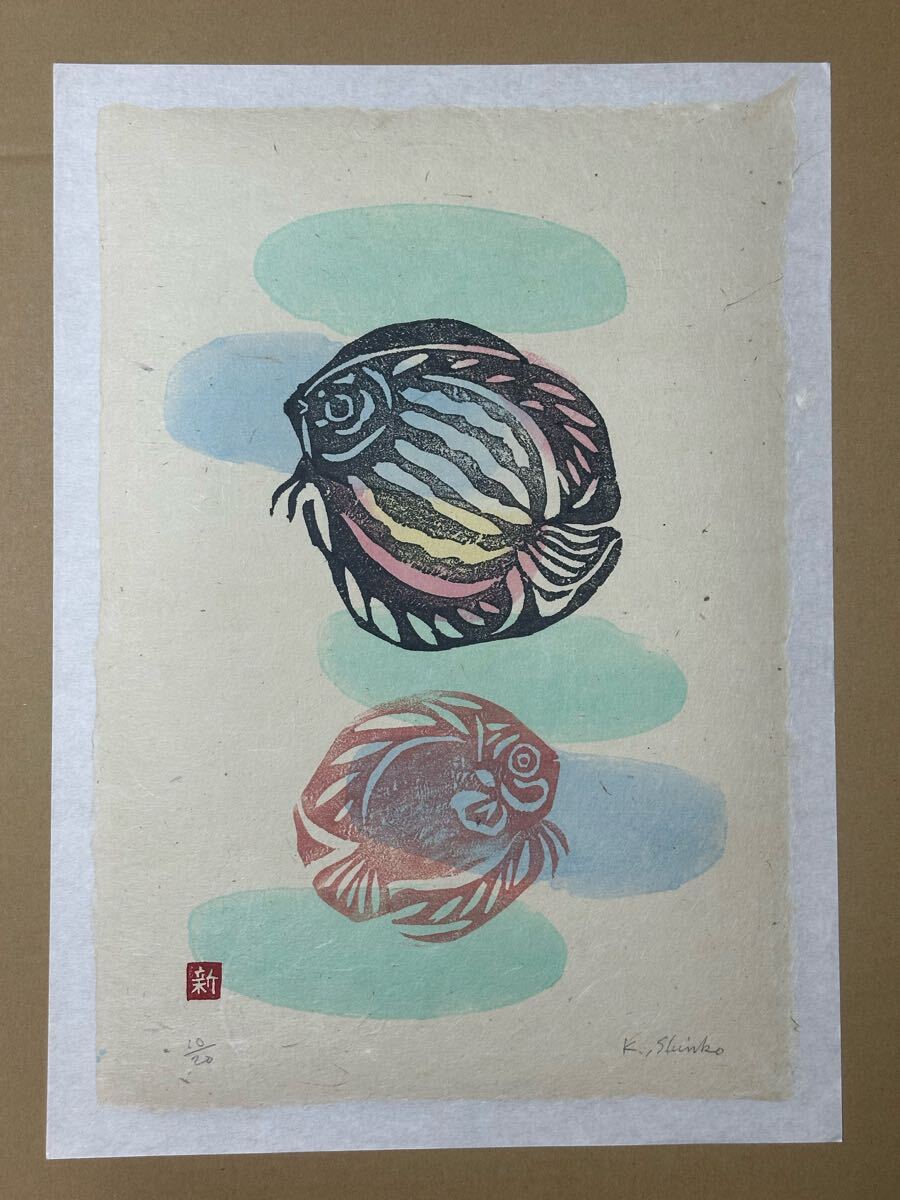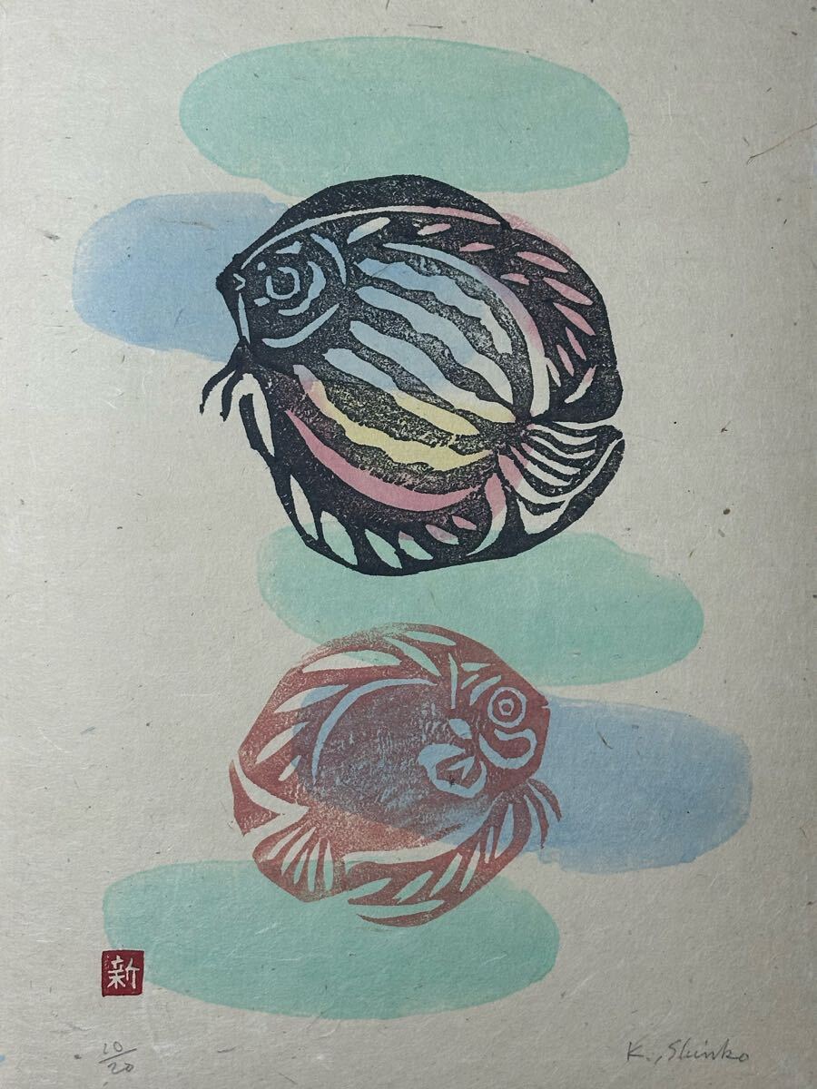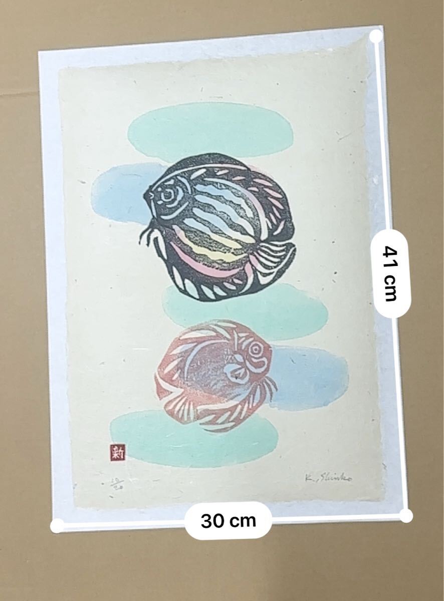 熱帯魚「ディスカス」の優雅な姿が、素朴な版画技法と柔らかな色彩で表現されています。独自の温もりある線と、和紙に映える淡いグラデーションが印象的です。