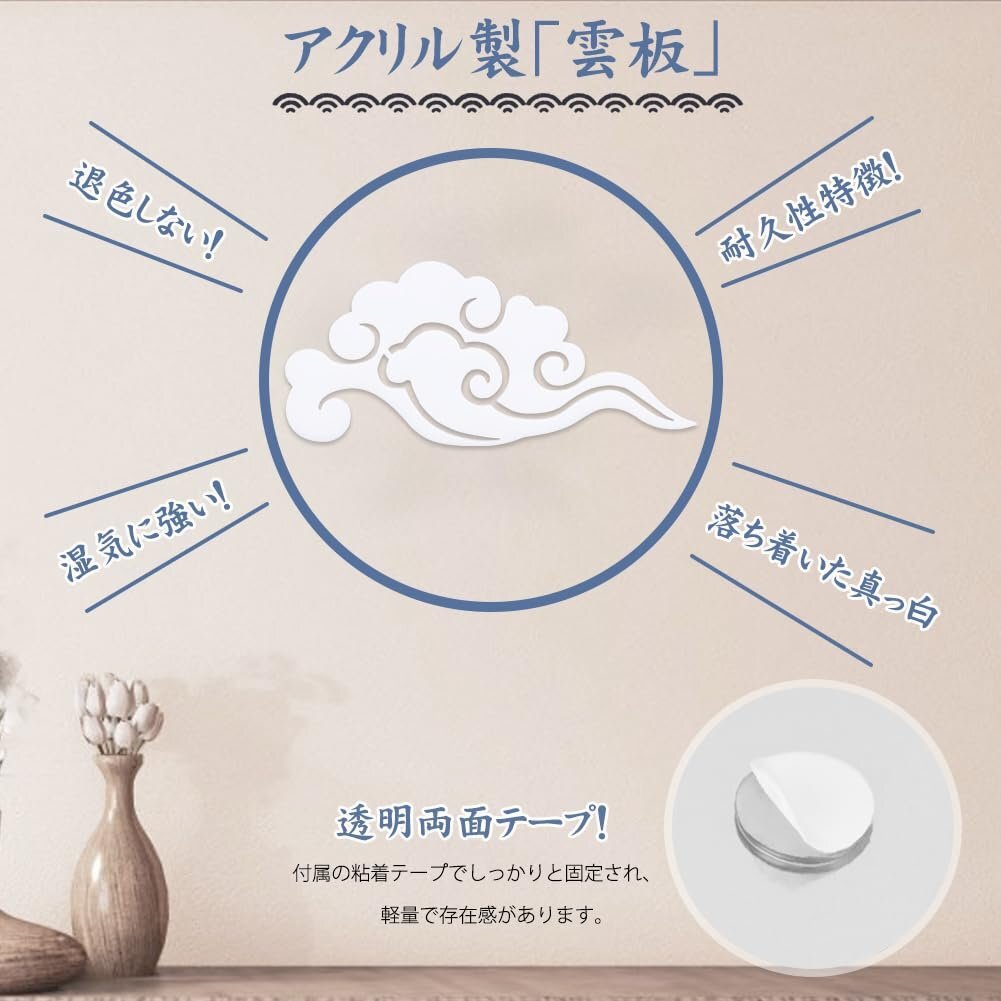 【アクリル製の雲】紙や木製の雲字に比べて、アクリル製は退色や変色しにくく頑丈で長くご使用いただけます。重量がただ30gぐらい、軽量で落ちる心配はありません。貼ってはがせる粘着テープがついているので、届いたらすぐにご使用になれます。