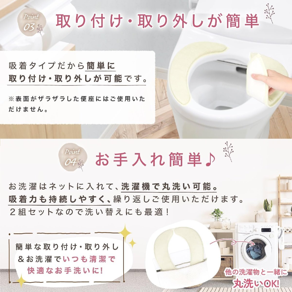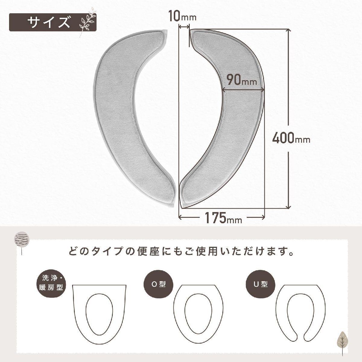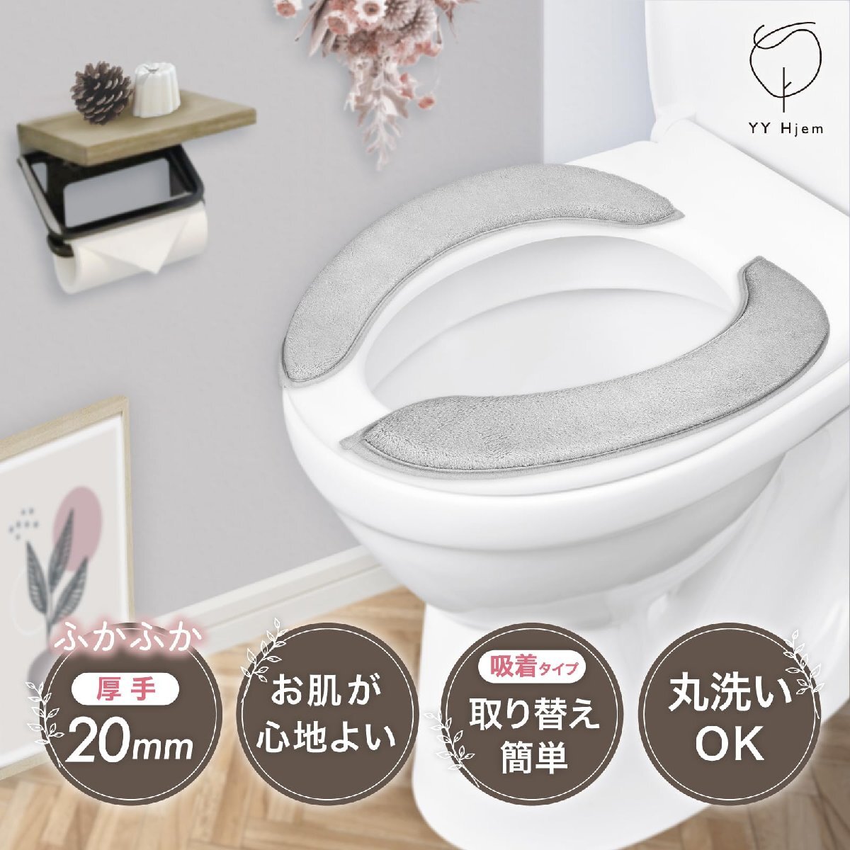 ブランド:YYHjemカラー:ライトグレー(ショートタイプ)サイズ:40cm×17.5cm【ご注意ください】商品はご購入時、2枚1組を抱き合わせておりその中央部に薄い透明フィルムが1枚貼り付けてあります。こちらの透明フィルムは吸着しませんので、剥がしてからご使用ください。吸着による貼り付けの為、ザラザラした面にはご使用いただけません。(ベタベタする粘着剤による貼り付けではありません。)便座の座面及び便座シートの吸着面は、しっかりと乾かした状態で貼り付けてご使用ください。厚みがある為、フタの形状によっては便座を上げた際便座が倒れてくる、フタが完全に閉まらない場合がございます。お洗濯の際は、記載する取扱い表示記号に従ってください。