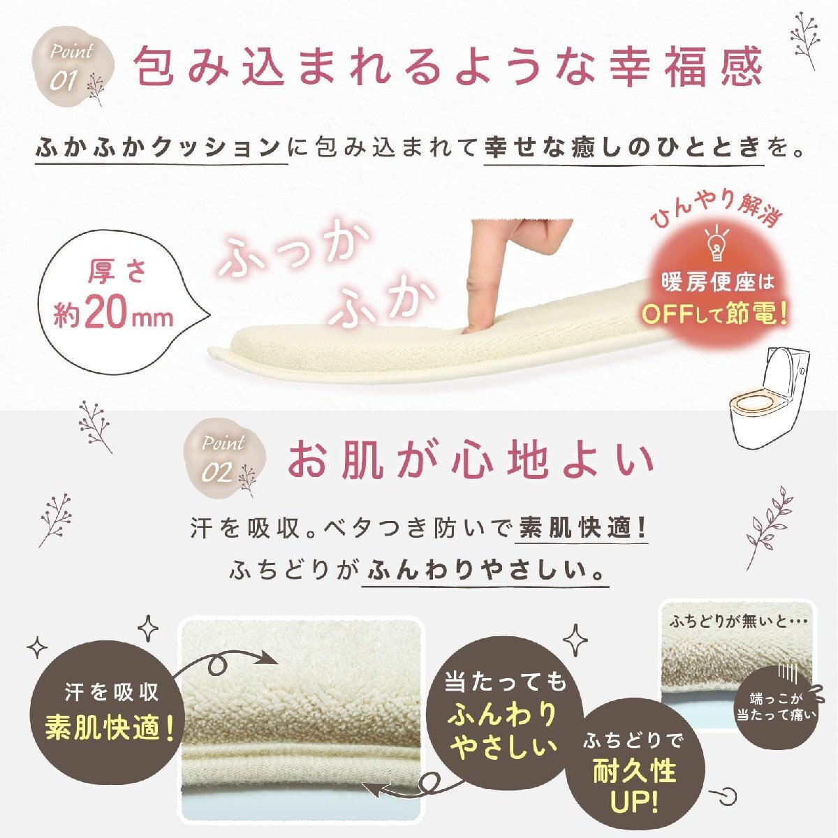 厚みが約20mmあるのでふかふかで座っていて心地よく快適です。座ってもひんやりしないので、便座の暖房はオフにして節電出来ます。