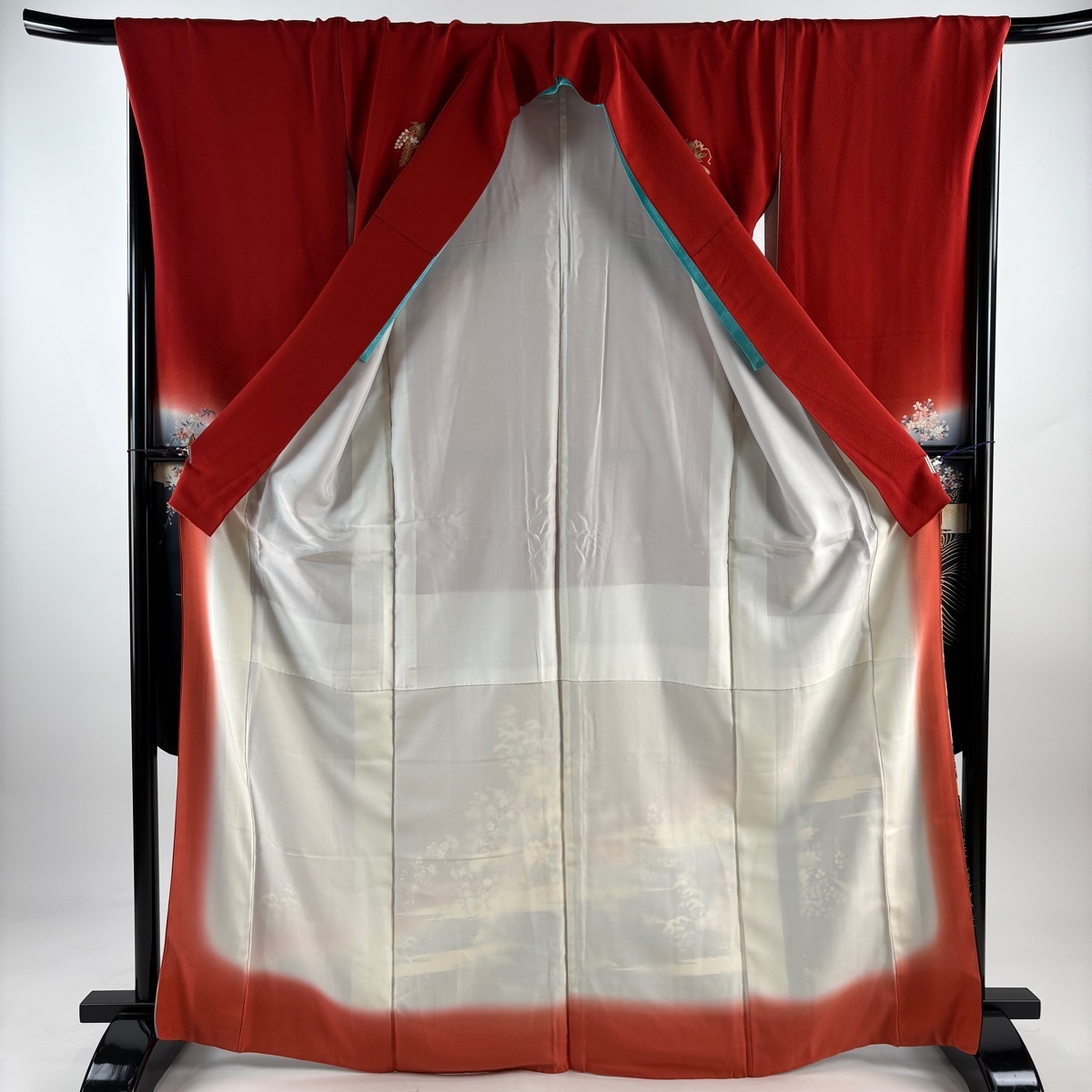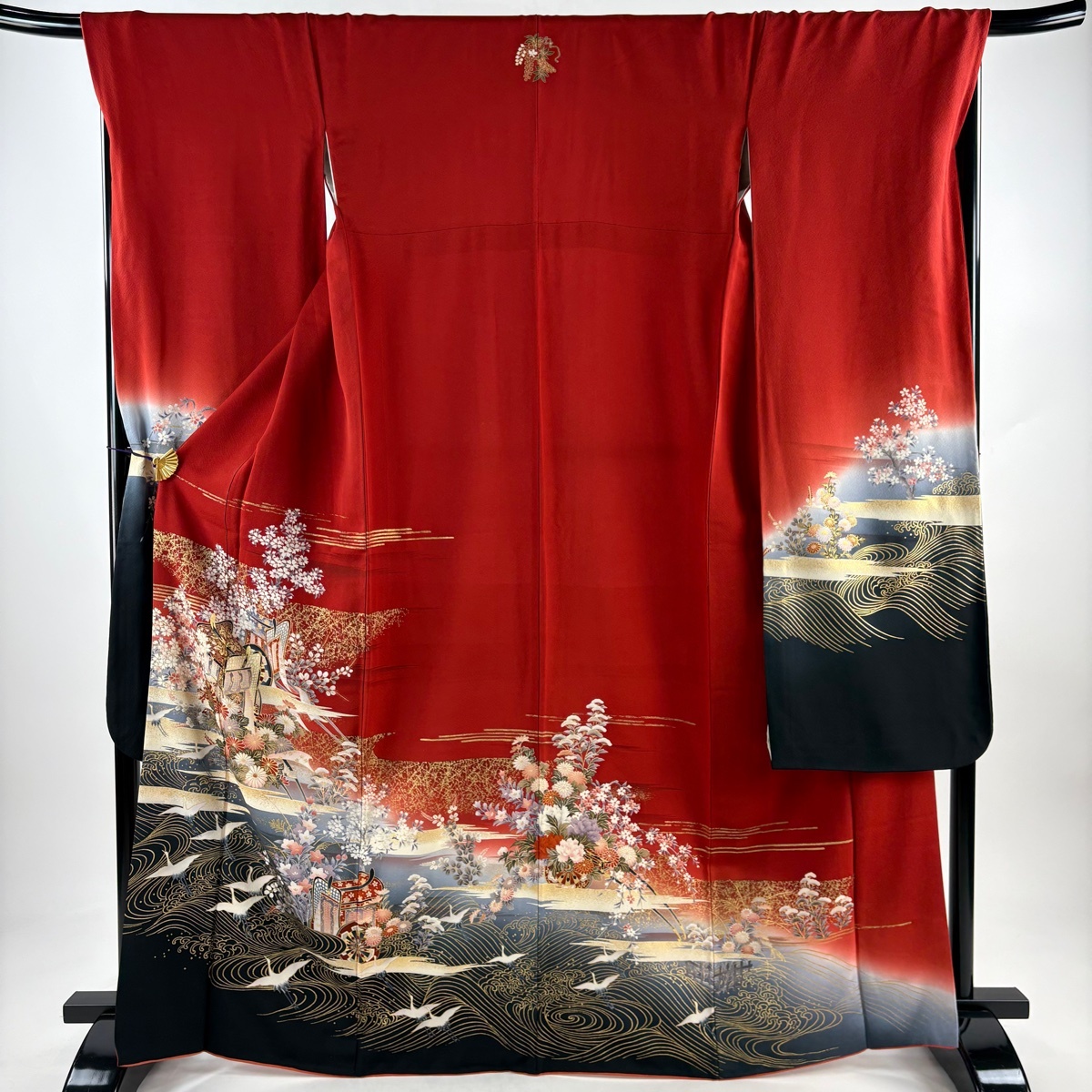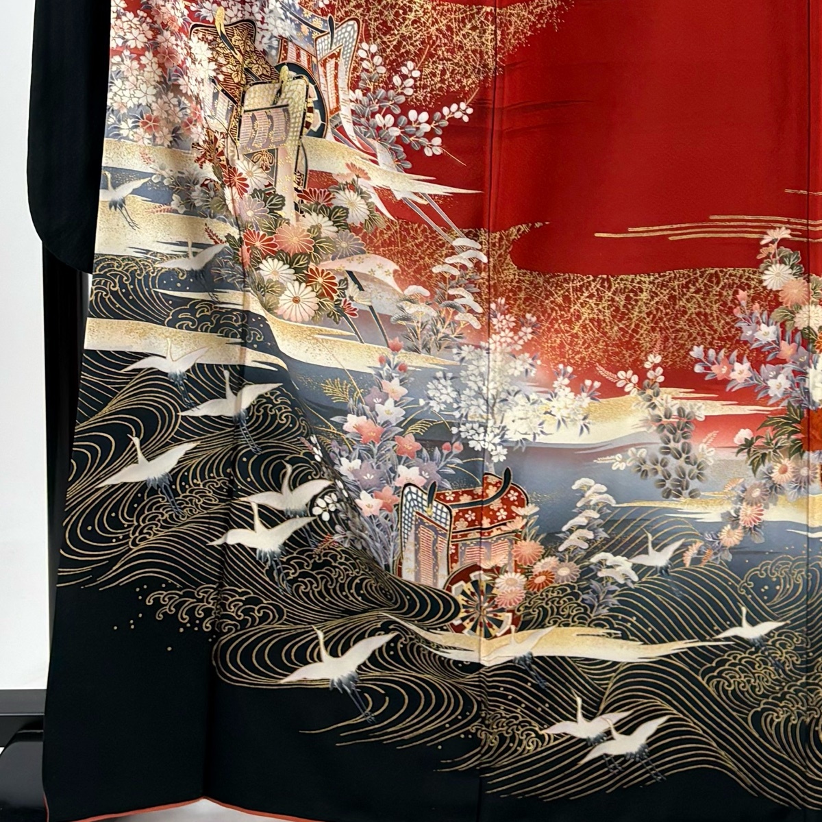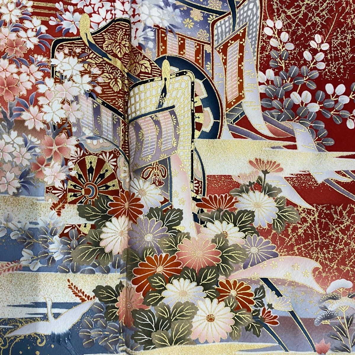 振袖 秀品 御所車 草花 金彩 赤 袷 身丈167.5 裄丈69 L 正絹 【中古】 |