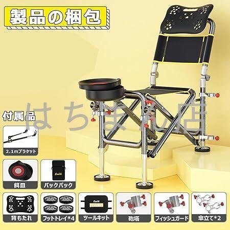 【セット内容】チェア本体+収納バッグ*2+10pcs部品(餌箱+ヘッドレスト+フットカバー*4+アンブレラスタンド*2+ターレットスタンド+漁網スタンド)素材:炭素鋼(補強亜鉛メッキ塗装)重量:3.13kg