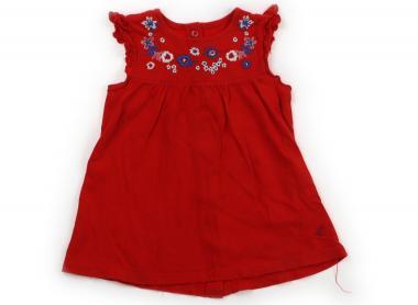 カットソー素材。後ろボタン開き。実際のサイズ表記は、12m。スナップボタンの一部に剥げあり。毛羽立ち・洗いざらし感があります。