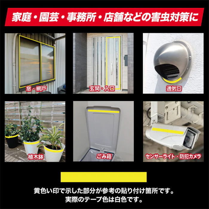 ・テープから放出される薬剤が空気中へ拡散し、飛来害虫や徘徊害虫に対して忌避・侵入防止・駆除効果を発揮します。