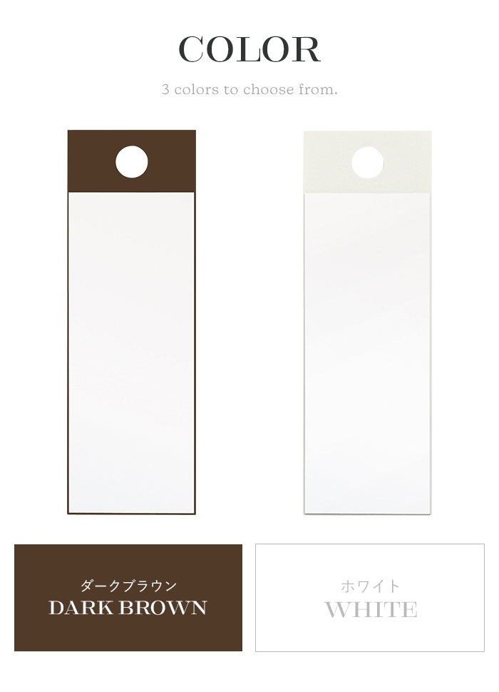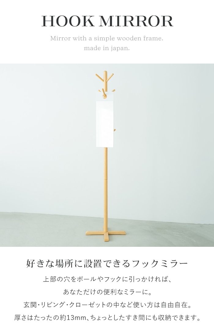 | 上部の穴をポールやフックに引っかければ、あなただけの便利なミラーに。 厚さはたったの約13mm、ちょっとしたすき間にも収納できます。 |