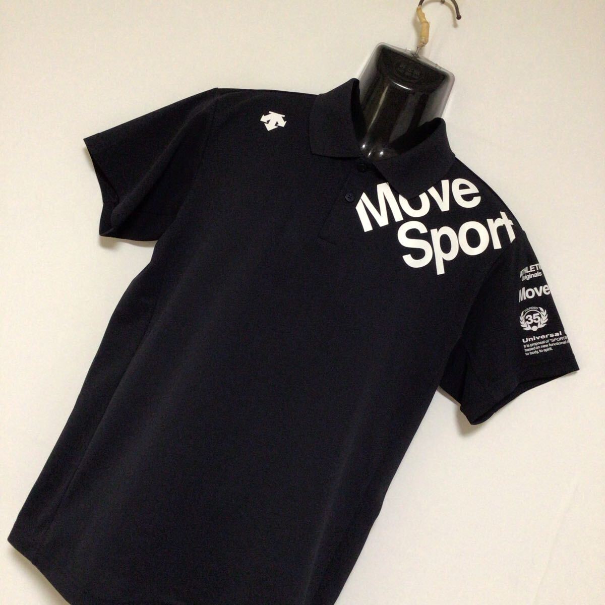 デサントムーブスポーツポロシャツになります。しっかりとしたシャツ生地、ロゴプリントが施されております。小さな薄汚れがございますが目立つ程ではございません。とてもオシャレな作りとなっておりますので是非オススメです。