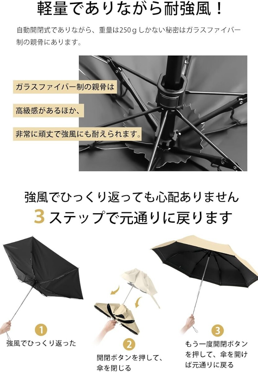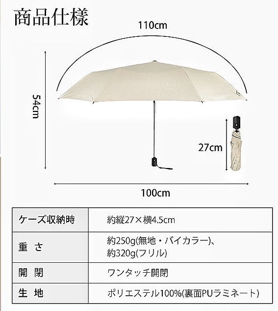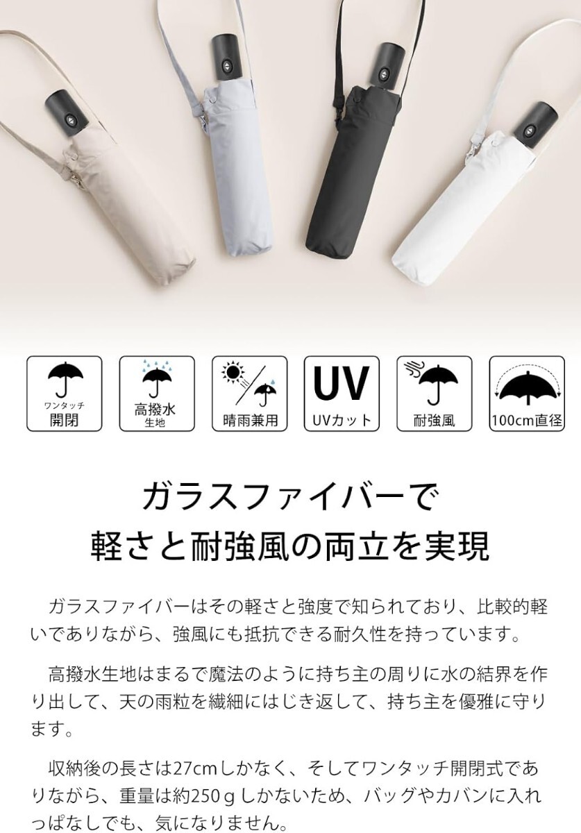【自動開閉おりたたみ傘】 ワンタッチで自動開閉ができる日傘は、片手でも使え、とっさに傘を出して開ける際にはストレスがありません。車の乗り降りの際や、片手しかあいて無い時には大変便利です。普通な通勤用カバンや車に常備しておけば、緊急天候にも対応できます。