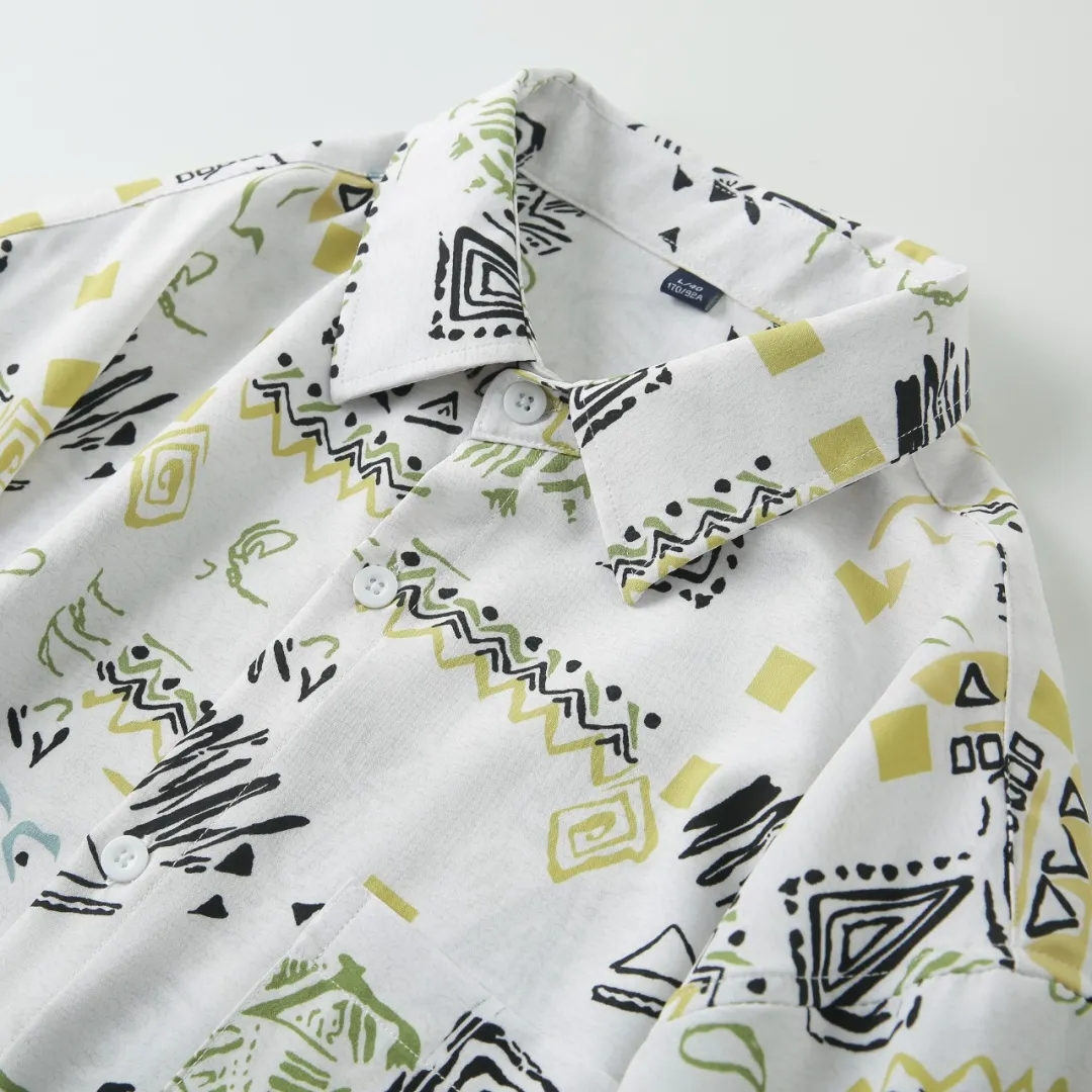 白ベースに幾何学アート柄が特徴的。ルーズフィットで、カジュアル & 個性的なスタイル。日常着やお出かけにピッタリ。