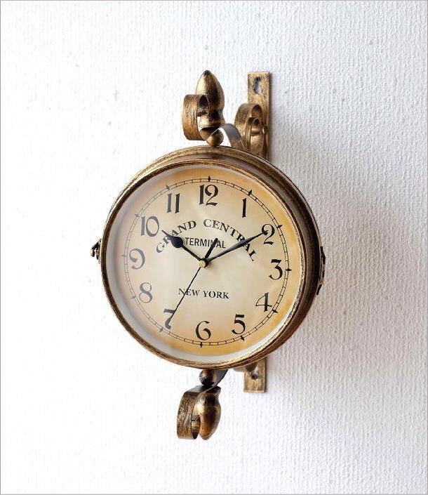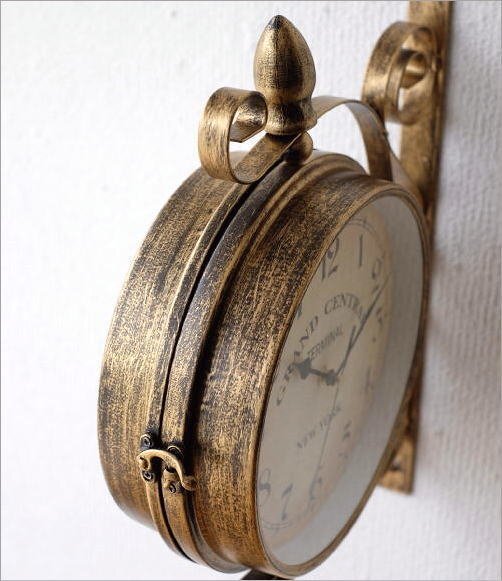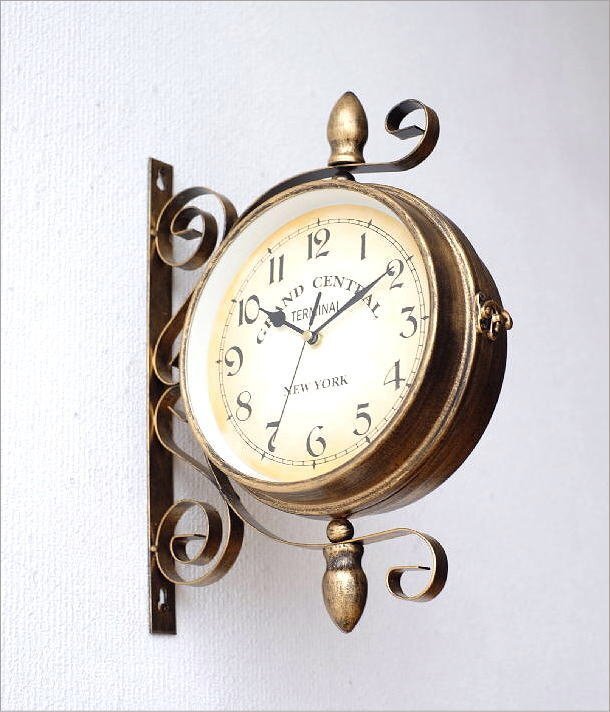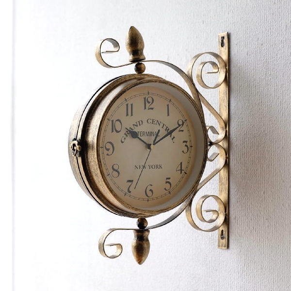 | 壁から垂直に飛び出して取り付ける 両面で見える掛け時計は 時計の部分が360度回転して お好きな角度で設置できます レトロカラーの文字盤の クラシックデザインの時計を囲むように アンティークゴールドアイアンの アラベスクラインを施した エレガントな雰囲気の時計で 空間を優しく華やかに演出します お店の看板のような雰囲気で カフェやショップなど インテリアのアクセントになりそうな オシャレな掛け時計です 商品名 : 両面ウォールクロック AQ/GD 商品番号 : vin5710 全体のサイズ(cm) : 幅28×奥行10×高さ37 時計サイズ : 直径20 壁から時計までの幅 : 5 材質 : アイアン ガラス 他 重量 : 1.7kg 生産国 : 中国 ※単三電池×2本、取り付け用ネジが付属しています ※壁の強度をお確かめの上お取り付けください ※本体やガラスの小傷・こすり傷、文字盤のプリント汚れ等はご容赦ください ※ディスプレイによる色の違いはご了承下さい |