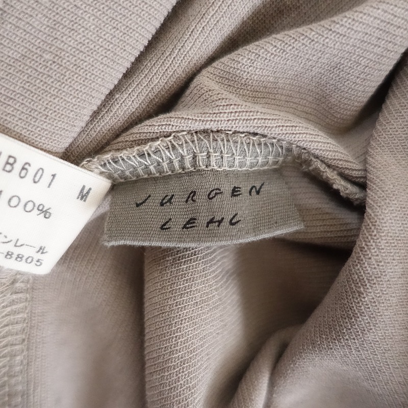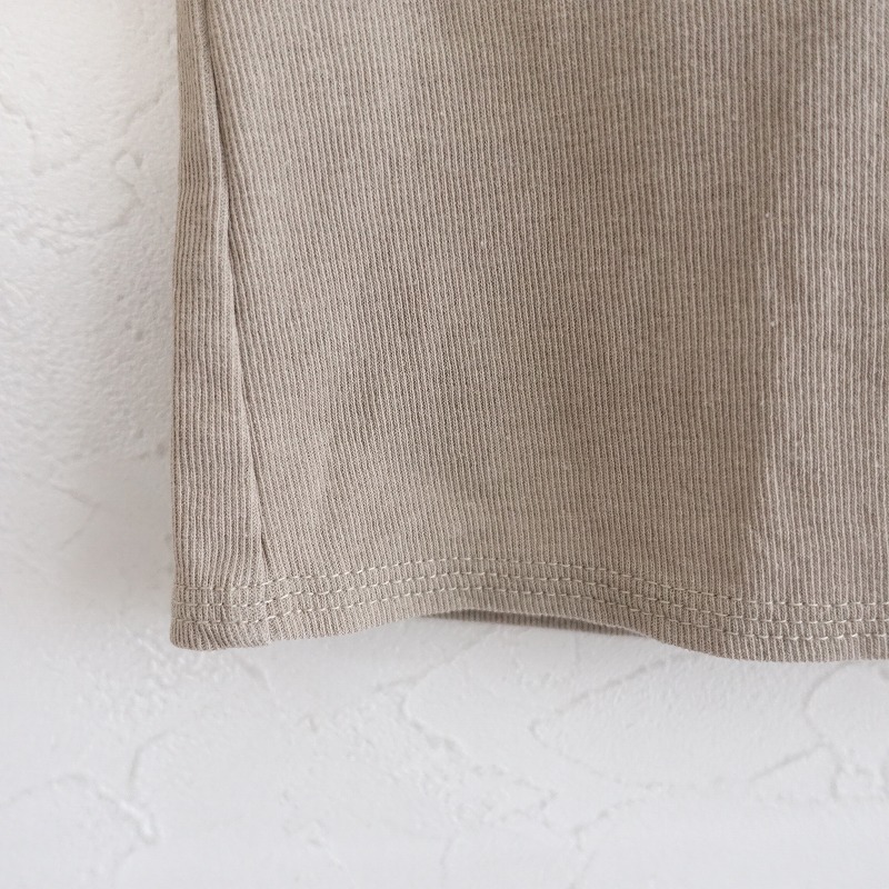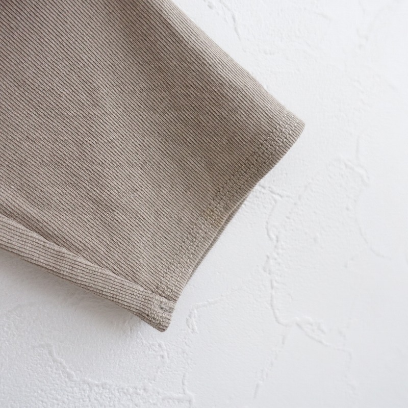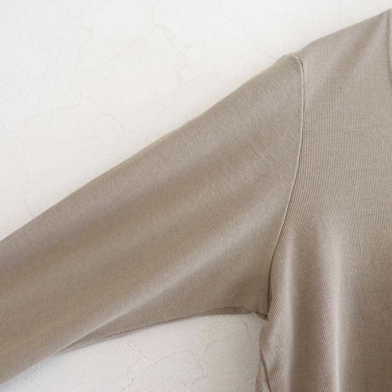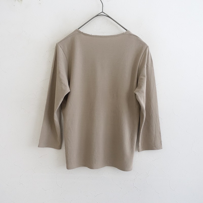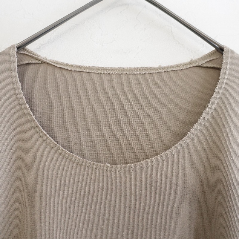 JURGEN LEHLの裁ち切りラウンドカラードライフライスカットソーです。カラーはモカベージュです。シャリシャリとしたドライコットンのフライスニット地を使用。清涼感があり、ストレッチ性の効いたリブ組織の素材です。大きく開いたラウンドネックは、共布テープを内側に配した裁ち切り仕様です。ポケットはございません。 |