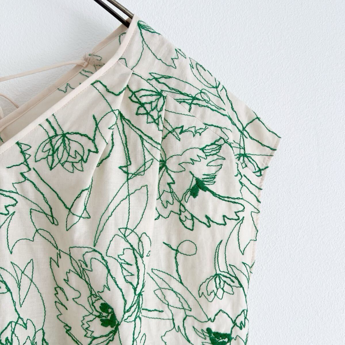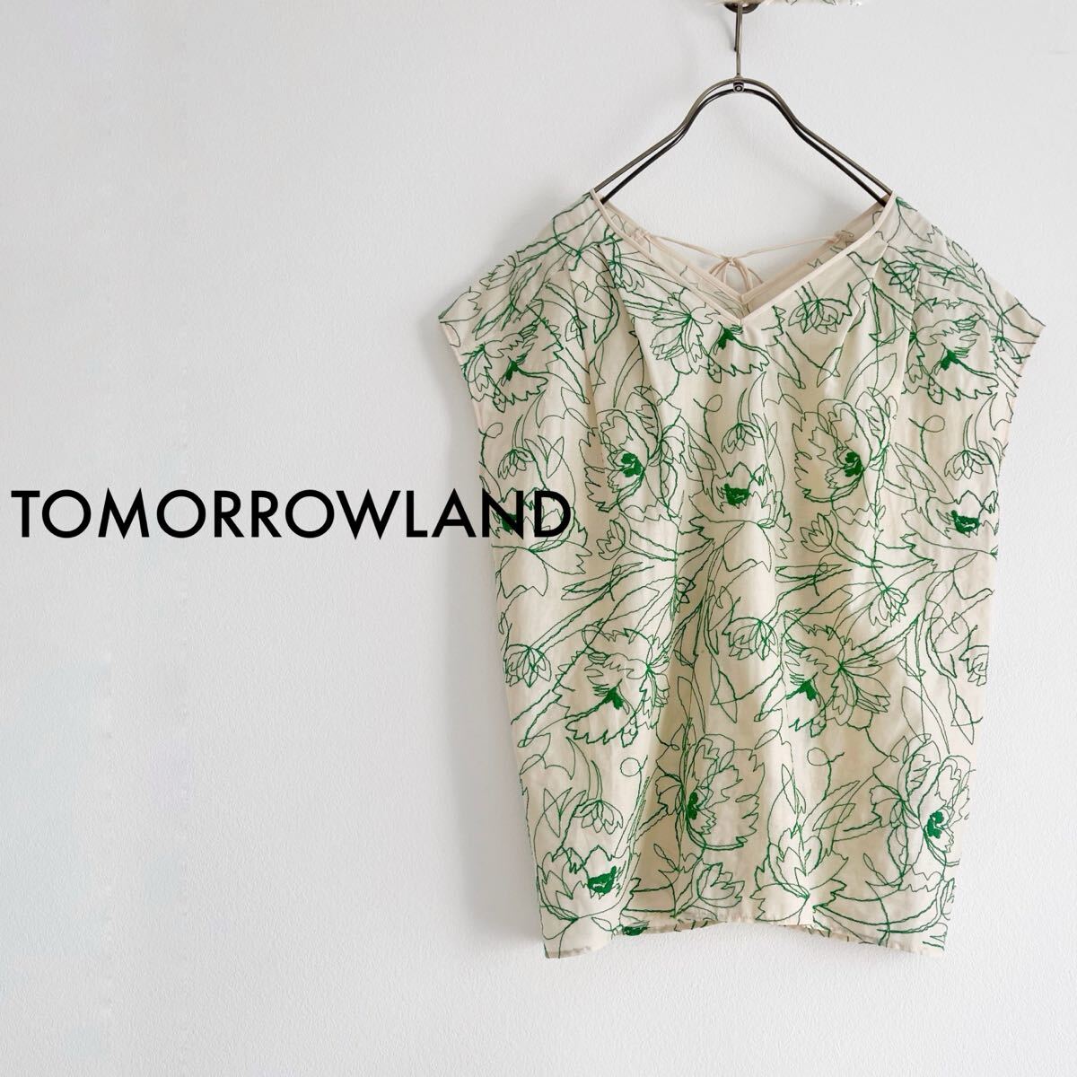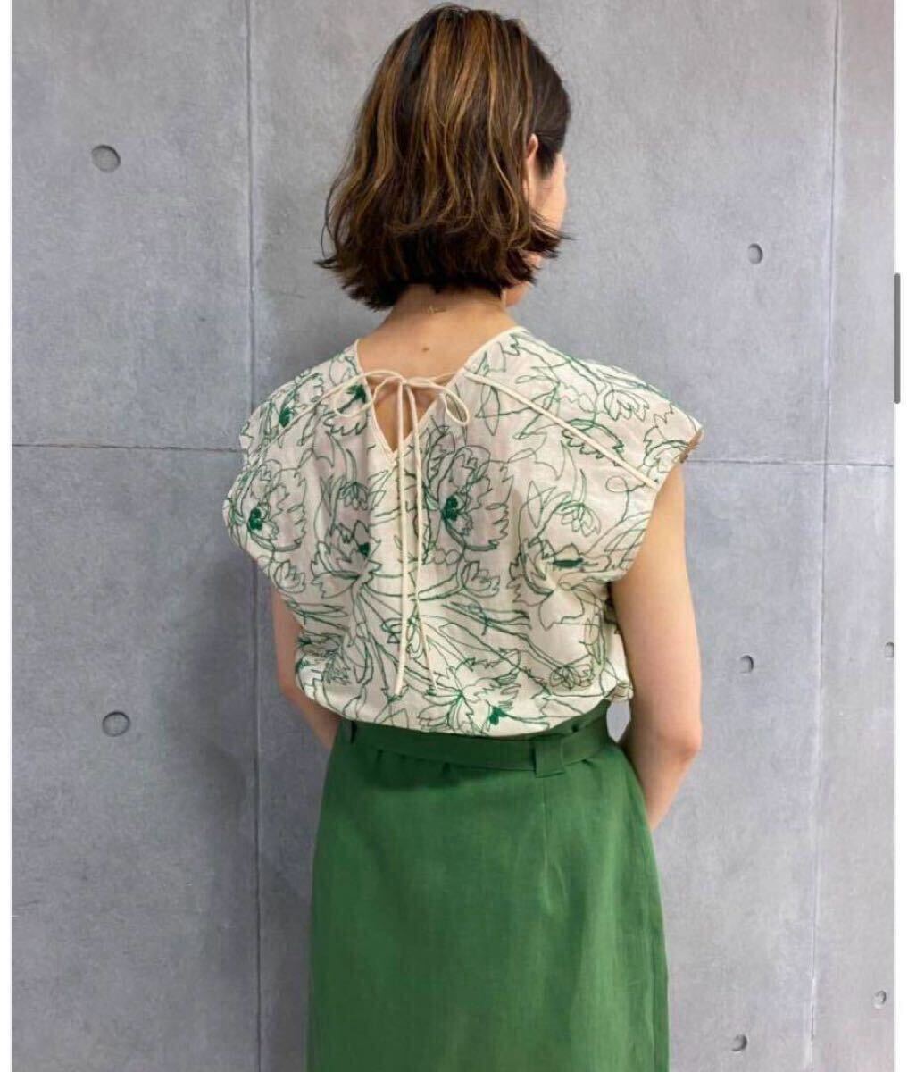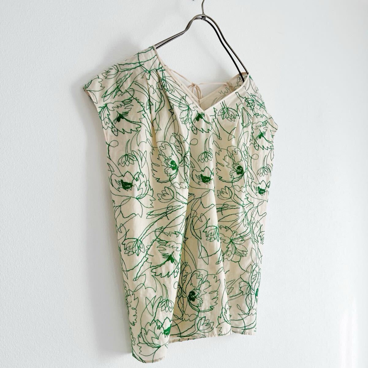 ハンドライティングのようなボタニカル柄の刺繍が印象的なブラウス。 ステッチを一本にしたり重ねたりすることでラインの太さに微妙な変化を付け、奥行きのある表情に仕上げました。 前後共にほど良いあきのVネックで、バックには華奢なリボンを配し後ろ姿にフェミニンなアクセントをプラスしています。 一枚でも着用しやすいキャップスリーブのデザインもポイント。 やや短めの着丈なのでタックイン・アウトどちらもバランス良く合わせられ、さまざまな着こなしをお楽しみいただけます。 着用感はほとんどなく綺麗です。 【ブランド】 TOMORROWLAND 【カラー】 グリーン 【表記サイズ】 36 【平置きサイズ】 着丈 60cm 身幅 48cm 【素材】 コットン100% 他にも多数出品しております こちらをクリック |