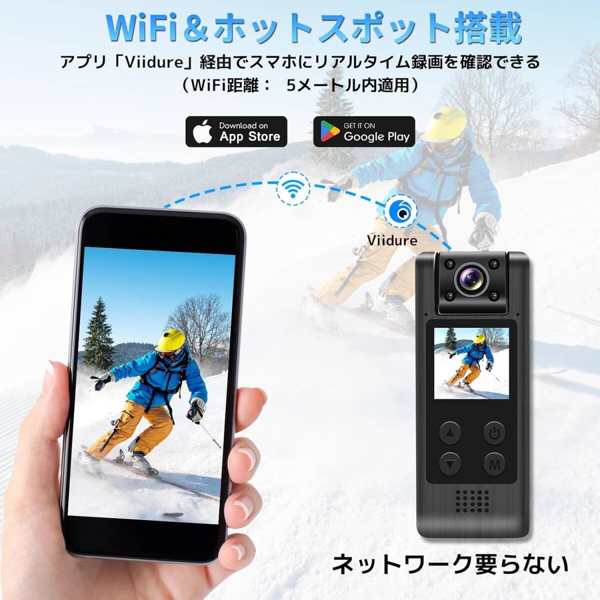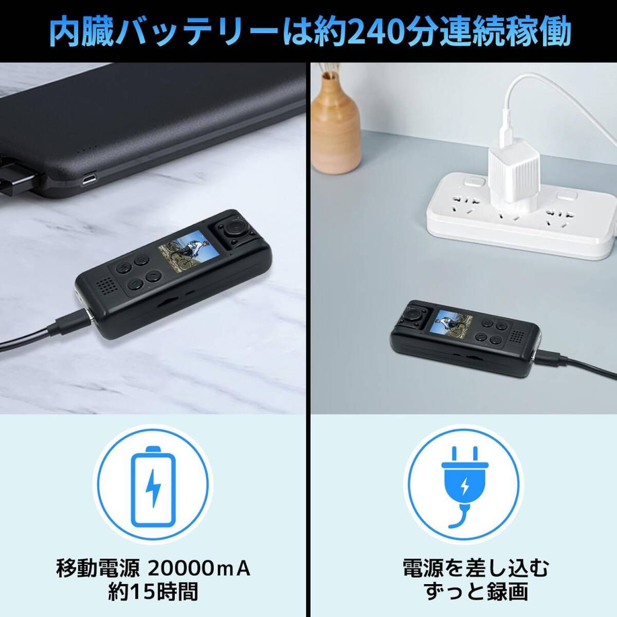 【真の4K HDR録画&充電しながら録画】真の4K映像と超広角120° FOVのボディカメラ、非常に優れた安定性を実現、滑らかで、水平をキープした動画を撮影できます。ハイコントラストな環境でも鮮明かつ自然な色合いを再現し、どんな撮影シーンやアクションだって細部までクリアに撮影。それに、内蔵バッテリーは約4時間続稼働ですが、移動電源 20000mAを接続して約15時間連続録画可能、電源(コンセントなど)と接続して充電しながら録画もできて、いつでも風景やアウトドアアクティビティの瞬間を美しく記録することができます。【隠し録画モード】スポーツカメラの隠し録画モードをオン場合、キー押す音が消音し、録画時にモニターが消灯状態のまま撮影します。ご自宅、事務室、倉庫、店舗、更にホテルに放置することができ、防犯の目的で浮気調査、犯罪防止、家族保護、財産保護、会議商談、ビジネスの証拠、家庭内暴力DVの証拠、セクハラ&パワハラの証拠、いじめの証拠としてなど様々な問題トラブル解決の対策に!【1.3インチ液晶画面&180°回転式レンズ】ペンクリップ式小型ウェアラブルカメラは180度回転レンズを搭載だけではなく、1.3インチのモニターも搭載し、撮影状況に応じて撮りたい角度に自由に向けられる同時に、録画状況などには一目瞭然で、モニターで確認しながら撮影できます。隠しカメラの回転で映像が逆になる心配はありません。さらに、PCとAPPは必要なく、アプリなど面倒な設定は一切なし、本体に各データを設定、ビデオ/写真を再生、削除など操作することができます。【暗視機能&夜間録画】4つの不可視赤外線ライトを装備したこのアクションカメラは、夜間でも鮮明な映像をキャプチャすることができて、安心して撮影が可能です。暗視モードは手動/自動で設定可能。自動モードを設定すると、暗闇、被写体が暗い等を検知すると自動で暗視モードに切り替わります。暗闇でも余計なボタン操作なく撮影することが出来ます。手動モードを設定すると、「下ボタン」を短く押すと、暗視モードになります。※照射範囲は約4~5m程となります。【動体検知録画】小型vlogカメラには動体検知機能オンすれば、周囲の動きに反応して自動的に録画開始/停止できます。常に撮影必要ない場合、無駄な録画を減らし、カードの容量を大幅に節約し、無駄な記録を頻繁に削除する必要はありません。【循環録画】ループ録画機能が付いていて、記録の容量がいっぱいになった場合に、古い映像を自動的に上書きして新しい映像を録画するようになり、途中で切れることも心配しなく無限に録画を実現します。外付けバッテリーを使って給電しつつなら、24時間の録画にも対応しています。※4GBから256GBのメモリーカードをサポートし、メモリーカードは別途購入する必要があります。【Wi-Fi搭載(APホットスポット)&スマホ連動】小型カメラのアプリは Android および iOS システムにダウンロードできます。 Wi-Fi に接続すると、アプリ「Viidure」経由でスマホにリアルタイム録画・再生できます。※APホットスポット距離:5メートル内適用、AP接続モードだけ対応、IP接続モードに対応していません。外出先から遠隔操作、遠隔確認は対応していません。【広く活用&コンパクト&優れた携帯性】この多機能カメラは、小さくて携帯性に優れ、長時間駆動することができ、大切な瞬間を撮り逃しません。海外旅行にも、家族行事にも持っていき、思い出をすべて映像に残しましょう。また、登山、スキー、ロッククライミング、サイクリング、ハイキング、サーフィン、または車載カメラや空中カメラとして、ほとんどどこでも使用することができます。