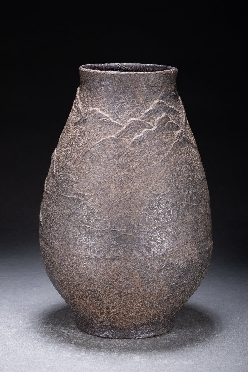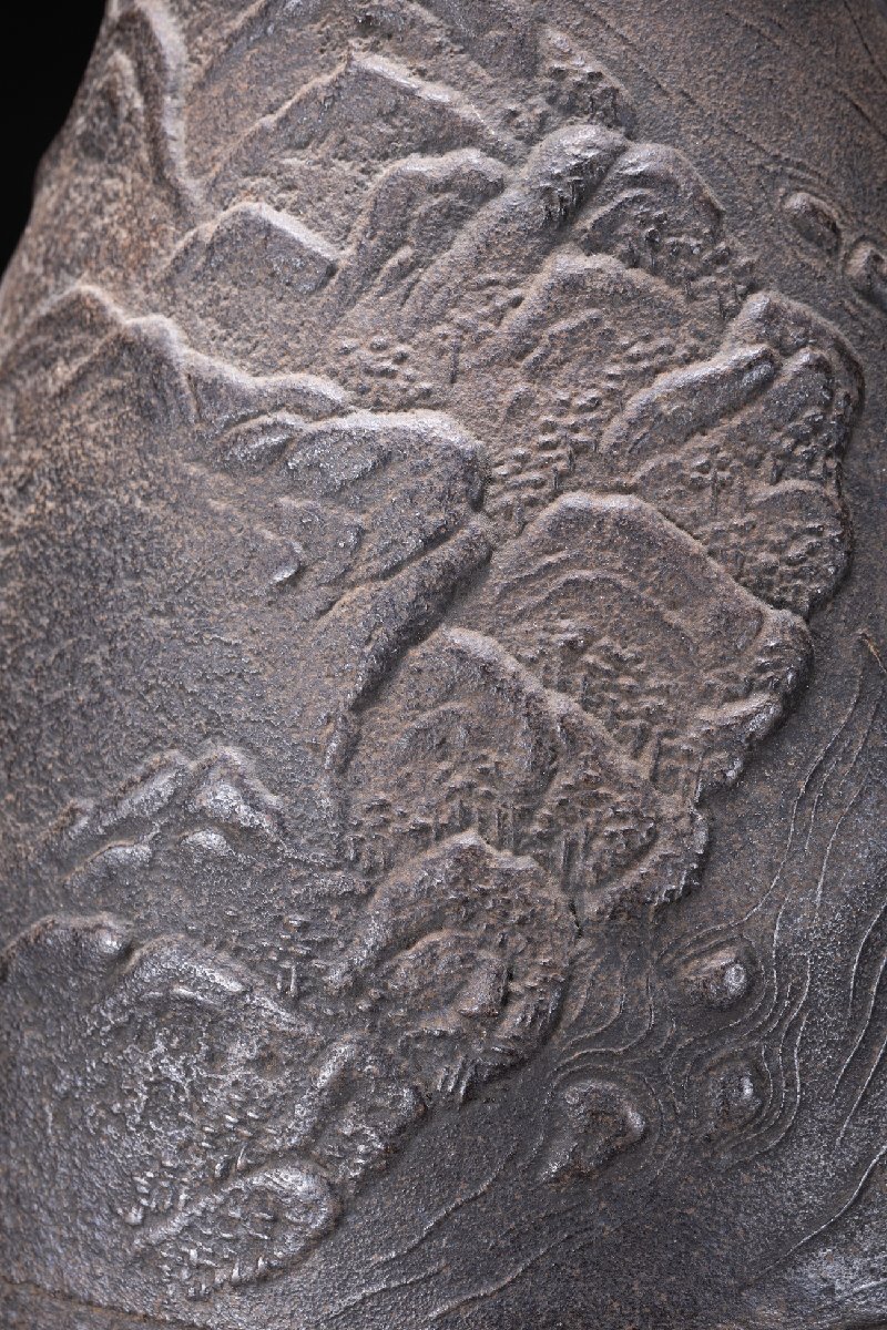 【清】某有名オークション購入 江戸~明治時代 鐵鋳 山水人物紋鉄瓶 花瓶 花入 花生 当時物保証 時代コレクション7L6-784S1
