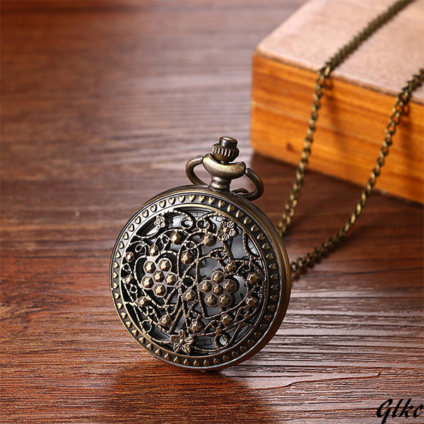 ハートモチーフのアンティーク調ブロンズケースが特徴的な懐中時計です。