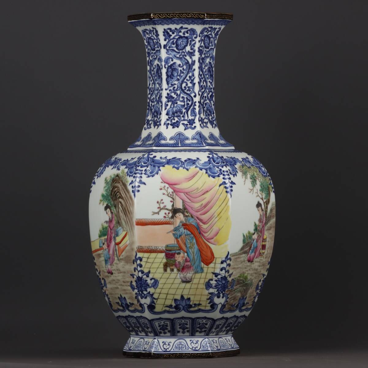 中国磁器 陶芸 磁器『青花に彩を加えた物語紋六方瓶です』施釉陶 古代工芸品 陶芸 精美彫 置物 收藏品 | |||