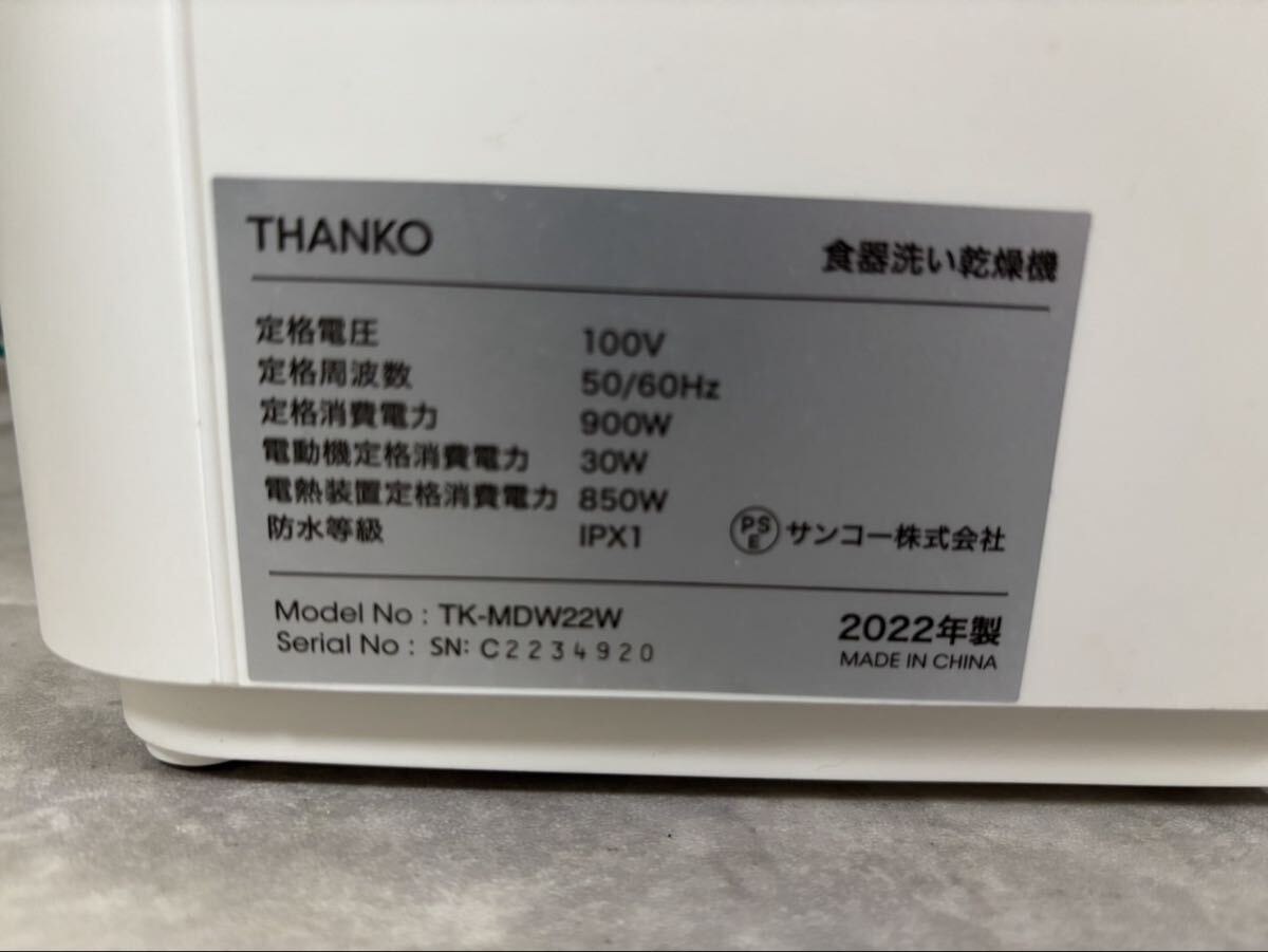 THANKO サンコー 2022年製 タンク式 食器洗い乾燥機 TK-MDW22W ラクアmini 通電確認済 やや傷、汚れあり 120サイズ
