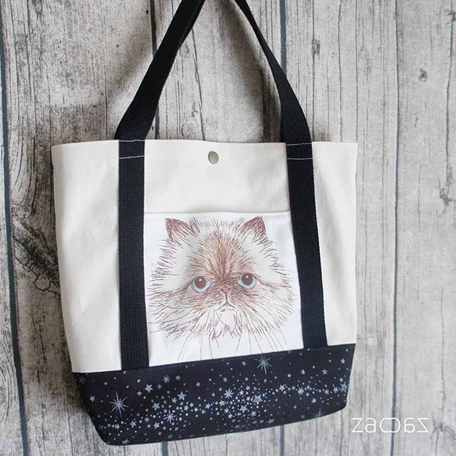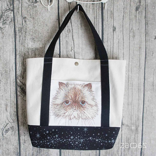 ポケットが猫の顔、底部分の星柄は銀ラメ生地を使用した可愛いトートバッグです。