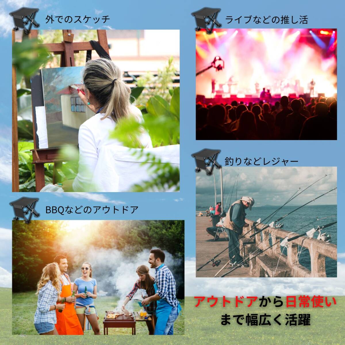 キャンプや登山、釣り、押し活、アウトドア、防災時の簡易椅子など屋内外問わず様々なシーンで活躍します。