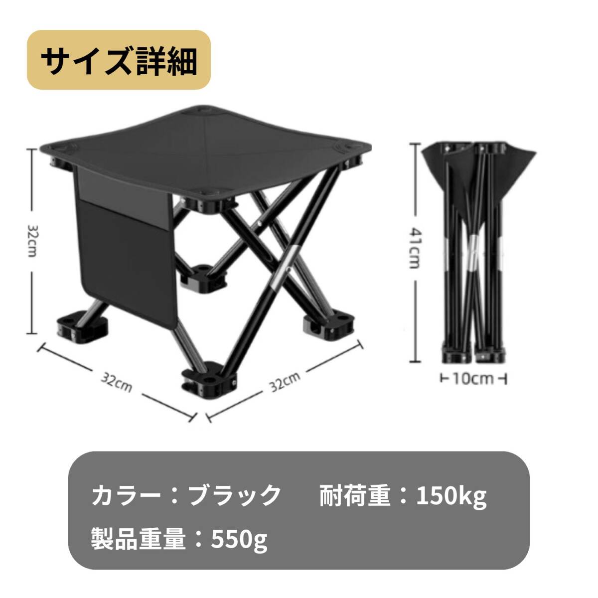 サイズ:広げた時の座面32cm×32cm、高さ32cm   折りたたんだ時の高さ41cm、横10cm(商品画像をご覧下さい)