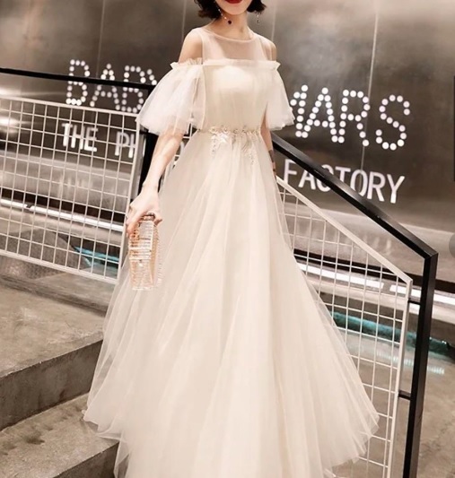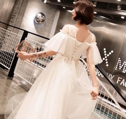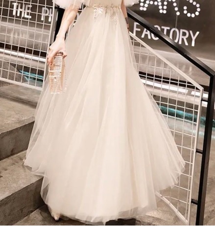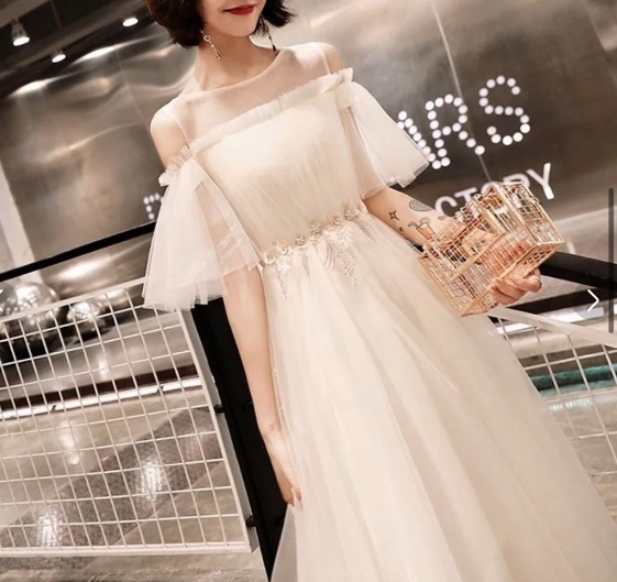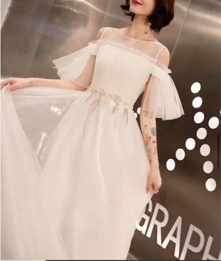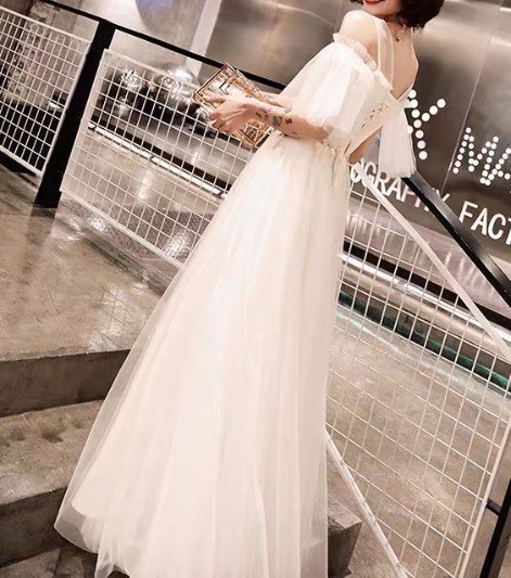 チュール肩見せロング丈のドレスす。白の下地に白のチュールをかぶせたエレガントなデザインです。袖は肩をみせて二の腕からフリル仕様になっています。胸元はチュールのみでデコルテラインを美しく見せてくれています。ウエストのフェイクパールがあしらわれたレースがアクセントになっていて、ピュアでエレガントな印象に。パーティやイベント、結婚式など、様々なシーンで、気品のある印象を与えてくれる一枚です。背中結び紐有り。背中腰から下ファスナ-有。胸パット付。